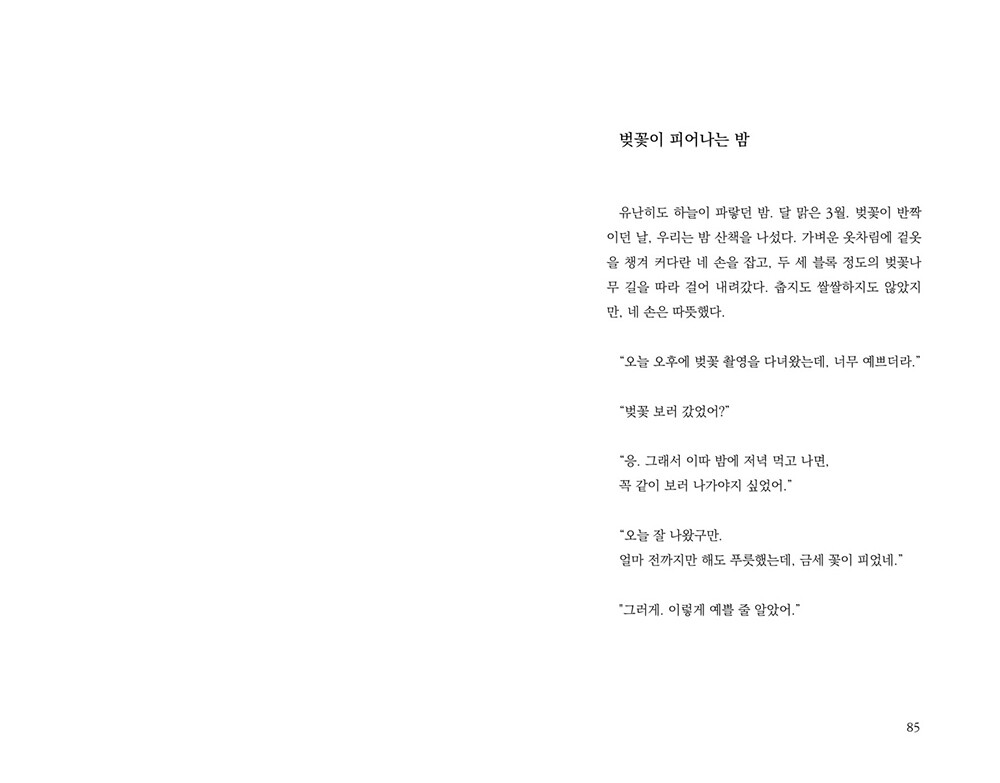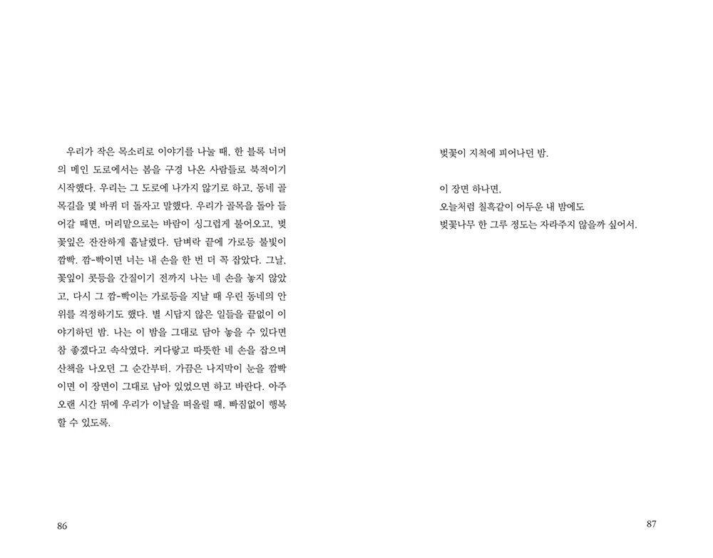 벚꽃이 지척에 피어나던 밤. 이 장면 하나면, 오늘처럼 칠흑같이 어두운 내 밤에도 벚꽃나무 한 그루 정도는 자라주지 않을까 해서. p87
