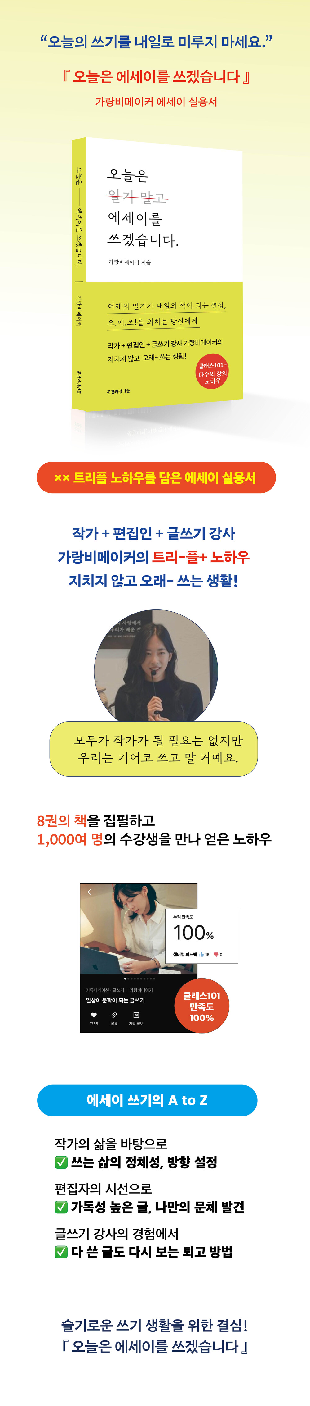 에세이 실용서 『오늘은 에세이를 쓰겠습니다』 는 10권의 책을 펴낸 작가, 출판 편집자이자, 1000여 명의 수강생을 만난 글쓰기 강사로 지내며 쌓은 글쓰기 노하우 집합서이다. 작가의 삶을 바탕으로 오래 쓰기 위해서는 무엇이 필요한지, 편집자의 시선으로 잘 읽히는 글은 무엇인지, 강사의 경험으로 글을 쓸 때 겪는 실제적인 어려움은 무엇인지. 끊임없는 물음을 던지며 해답을 찾아갔다.