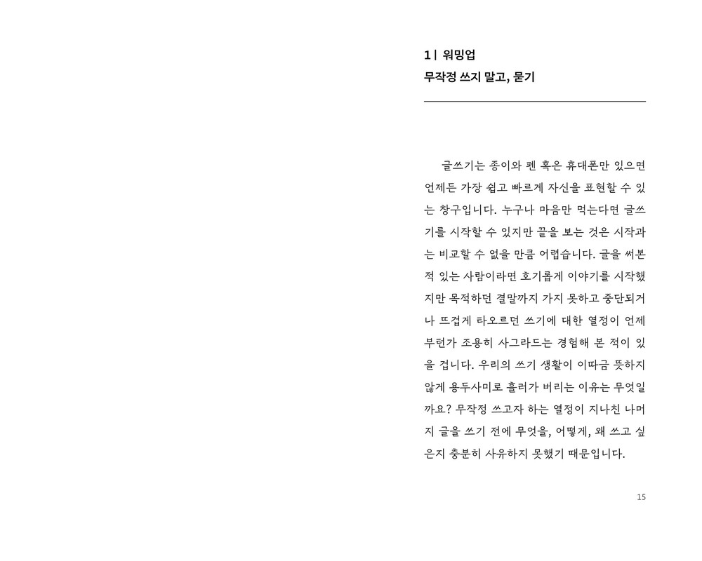내가 쓰는 이유를 안다는 것은 글쓰기를 통해 가고자 하는 목적지를 아는 것입니다. 글을 쓰며 도착하고 싶은 곳이 어딘지 안다면 출발할 때부터 우리의 마음가짐을 달라집니다. 누군가는 아주 멀리 나아가기 위해서 조급해 하지 않고 천천히 숨을 고르며 써나갈 것이고다른 누군가는 출간이라는 선명한 목표에 따라서 촘촘히 매일의 쓰기를 성실하게 해나갈 것입니다