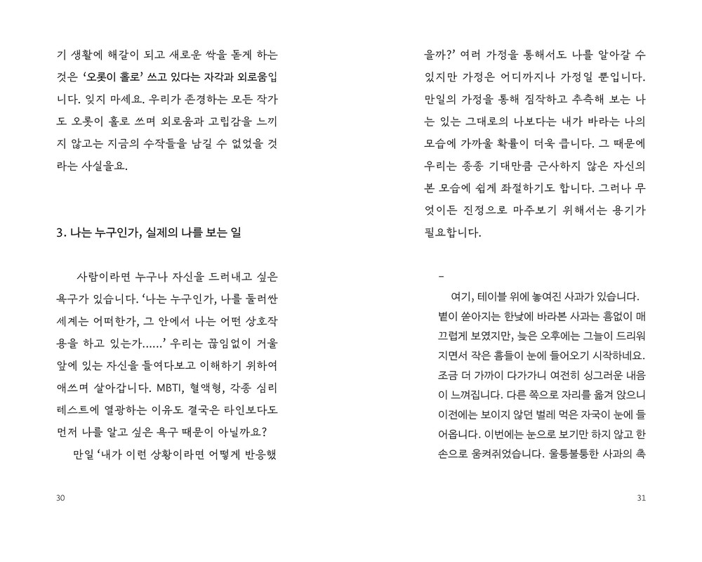 글쓰기는 결코 자극적인 즐거움을 선사하는 행위는 아닙니다. 그러나 생각보다 깊은 즐거움을 느끼게 하는 일입니다. 누구도 묻지 않은 내 안의 이야기를 고백하는 일, 문제를 해결할 수는 없지만 묵은 감정을 해소하는 일, 그리하여 나를 온전하게 이해합니다. 글을 통해 나를 마주할 때 비로소 우리는 자신을 둘러싼 수많은 관계와 세상을 오해하지 않고 이해할 수 있다고 믿습니다. 느리지만 천천히 자신만의 시선을 찾아가면서요.