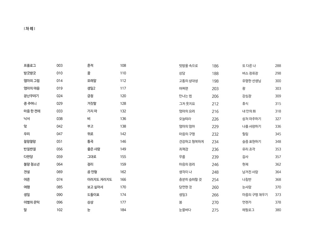 프롤로그 / 방긋방긋 / 엄마의 그림 / 엄마의 마음 / 장난꾸러기 / 콩 주머니 / 마음 한 켠에 / 낙 서 / 앜 / 우리 / 찰랑찰랑 / 반질반질 / 다판당 / 불량 청소년 / 전설 / 어른 / 여행 / 생일 / 이별의 문턱 / 말 / 흔적 / 꿈 / 모래알 / 생일2 / 긍정 / 거짓말 / 가지 마 / 비 / 부고 / 위로 / 통곡 / 좋은 사람 / 그대로 / 정리 / 곰 인형 / 이러지도 저러지도 / 보고 싶어서 / 도돌이표 / 상상 / 눈 / 빗방 울 속으로 / 상담 / 고통의 상대성 / 어쩌면 / 만나는 법 / 그저 웃지요 / 엄마의 요리 / 오늘따라 / 엄마의 엄마 / 마음의 구멍 / 건강하고 행복하게 / 죄책감 / 무릎 / 마음의 정리 / 생각이 나 / 충 분히 슬퍼할 것 / 당연한 것 / 생일3 / 봄 / 눈물바다 / 또 다른 나 / 버스 정류장 / 유명한 선생 님 / 쾅 / 강심장 / 휴식 / 내 안의 화 / 상처 마주하기 / 나를 사랑하기 / 힐링 / 슬픔 표현하기 / 유리 조각 / 감사 / 현재 / 남겨진 사람 / 나침반 / 눈사람 / 마음의 구멍 채우기 / 언젠가 / 에필로그