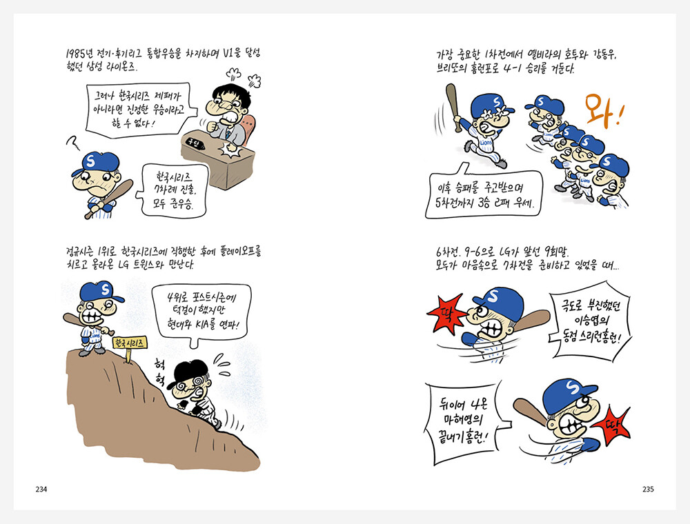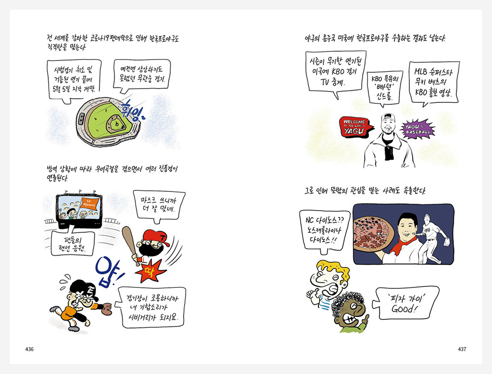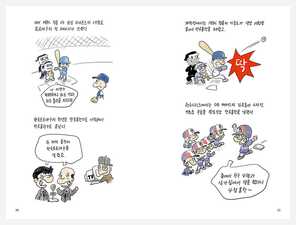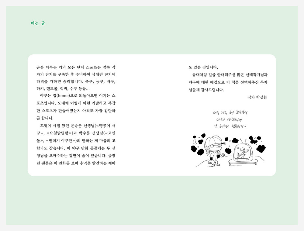 1982년 이만수 선수의 홈런으로 시작해서 한국시리즈까지 결국 만루홈런으로 장식한 프로야구 원년부터 2008년 베이징올림픽 우승을 거쳐 2020년 코로나19 팬데믹 영향으로 전례 없는 무관중 경기 와중에도 무사히 리그를 마치기까지. 그 사이 태어나고 사라지길 거듭한 애증의 팀과 선수들, 한 권에 정리가 가능할까 싶을 정도의 방대한 역사를 박성환 작가는 특유의 유쾌하고도 향수어린 그림으로 누구나 읽기 편하게 담아냈다. 매년 한국시리즈 우승팀을 기리는 굵직한 이벤트와 잊을 수 없는 에피소드, 프로야구사를 장식한 경이적인 기록들이 알차게 실려있어 원년 팬들에게는 향수를 불러일으키고 어린이 팬들에게는 신선한 이야기를 전달한다. 한국프로야구사를 한 권에 담은 이 책은 야구를 좋아하는 팬들이라면 어른, 아이 누구나 같이 즐길 수 있다.