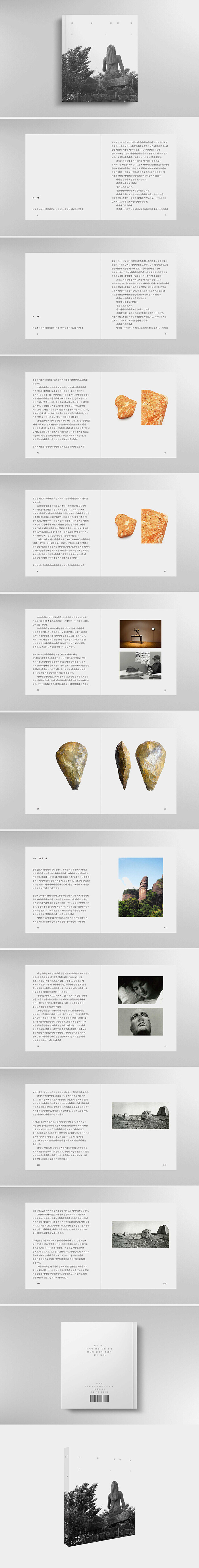 p40. 우리의 시선은 김경태가 촬영한 돌의 표면을 통해서 돌을 처음 보듯이 본다. 그 안에는 어떤 사실들이 숨어 있다. 각각의 돌이 경험한 세월은 켜켜이 축적되어 빽빽한 시간의 숲을 이루고 있다. 우리는 뚜렷한 목적 없이 돌의 입자 위를 걷는 탐험가가 된다. 마치 가택연금 동안 자신의 익숙한 방 한 칸을 구석구석 묘사하는 책을 써 보았던 묘사하는 책을 써 보았던 어느 18세기 작가처럼, 우리는 이 또렷한 이미지의 프레임에 감금된 채 그동안 흔하게 보아 온 돌의 얼굴 구석구석에 다시 시선을 던질 것을 요청받는다.