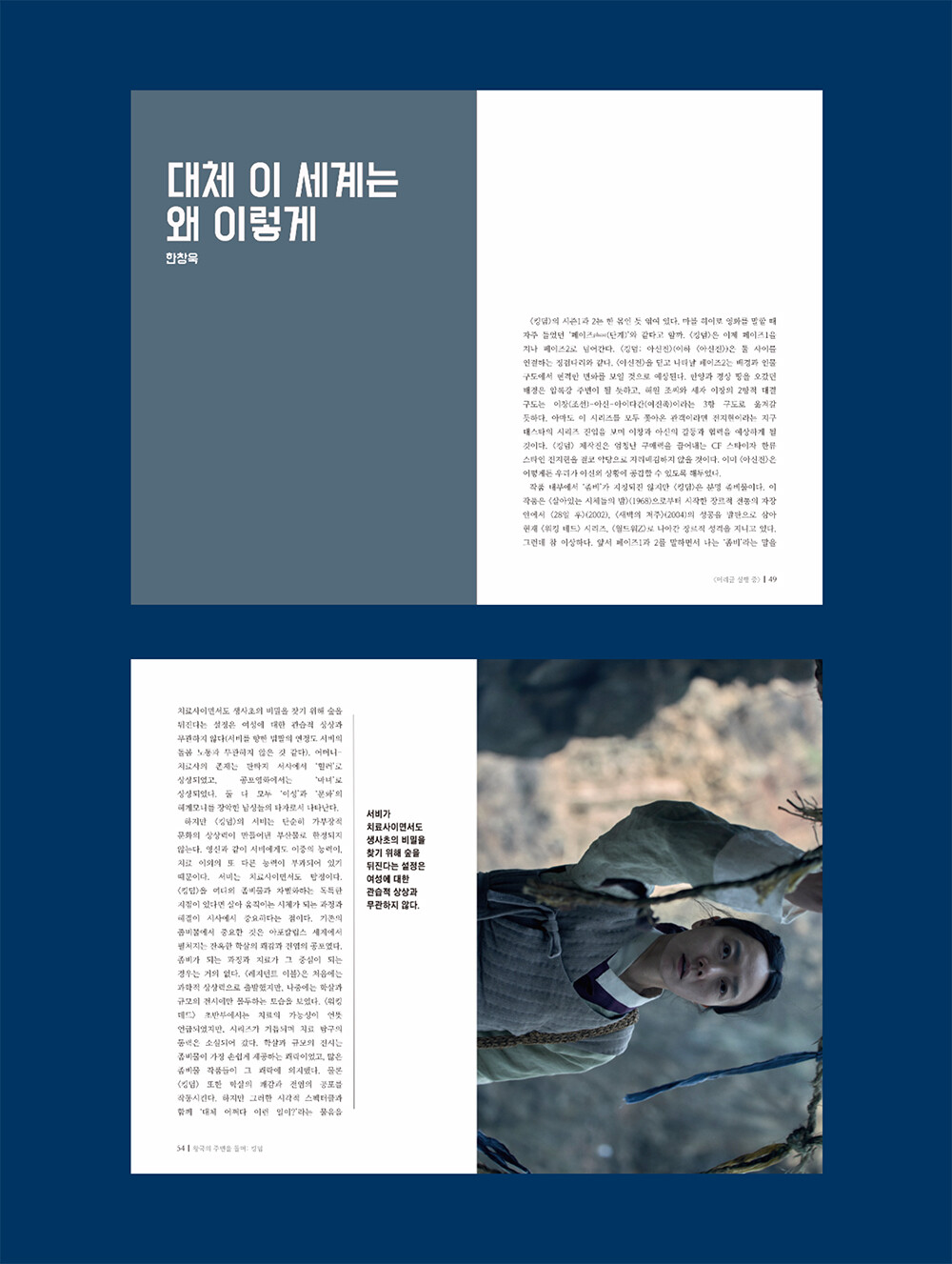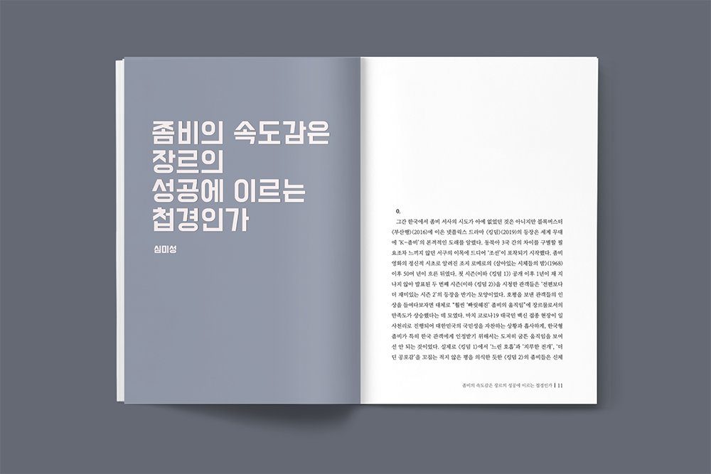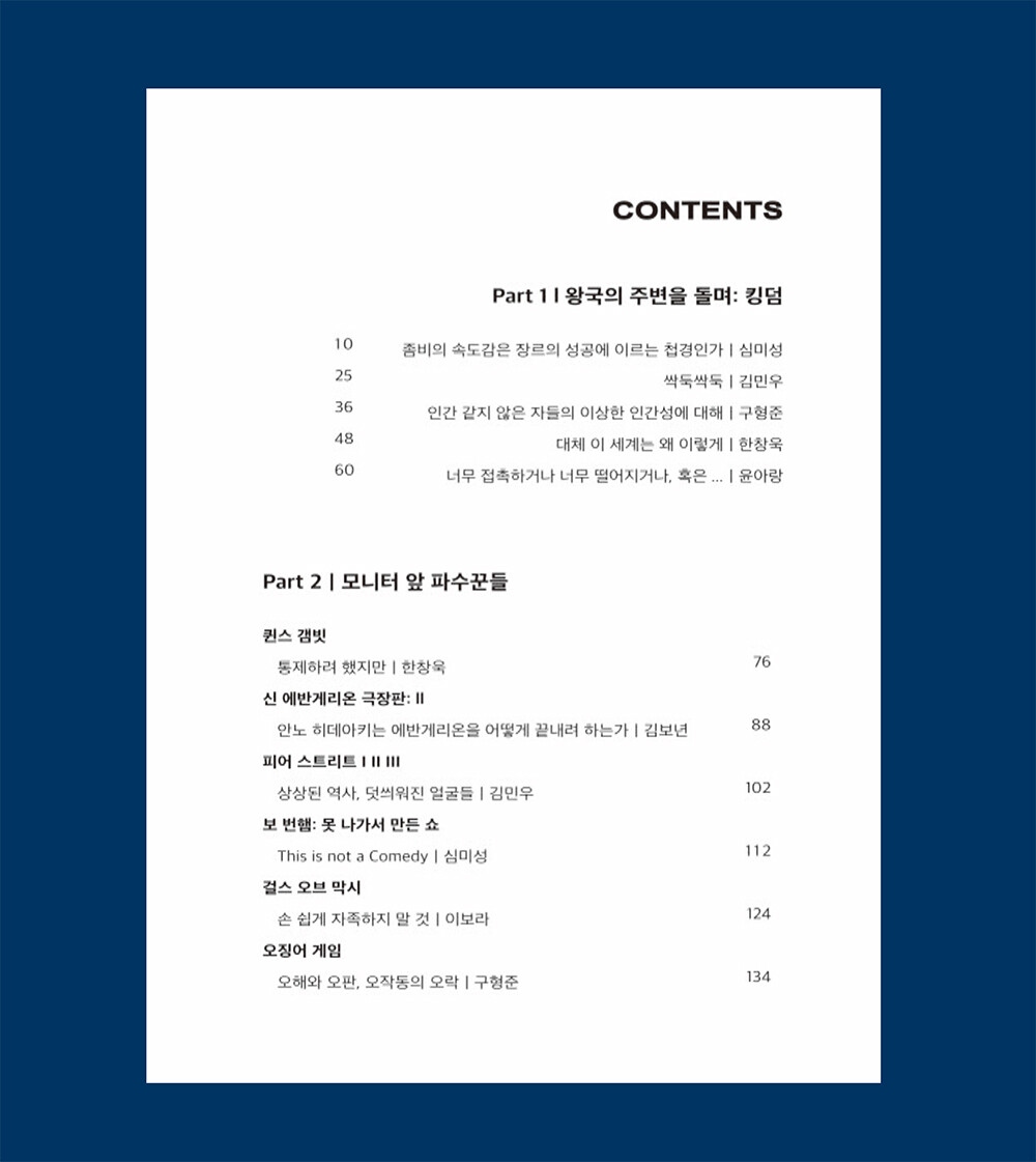 [비옽] 창간호는 2개의 챕터로 이루어져있다. 한편의 시리즈를 여러 방향에서 톺아보며 다수의 필자가 다면적 분석을 하는 1부와, 다종다양한 OTT작품들 사이에서 아직까지 비평의 손길이 닿지 못했거나, 혹은 더 말할 필요가 있는 작품을 다루는 2부다.