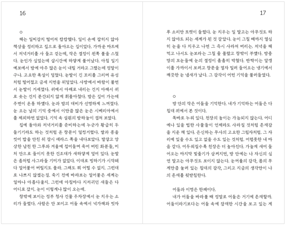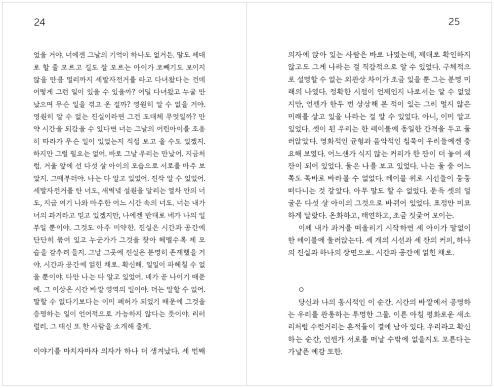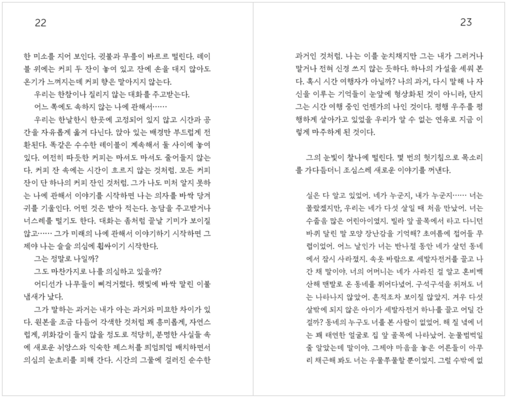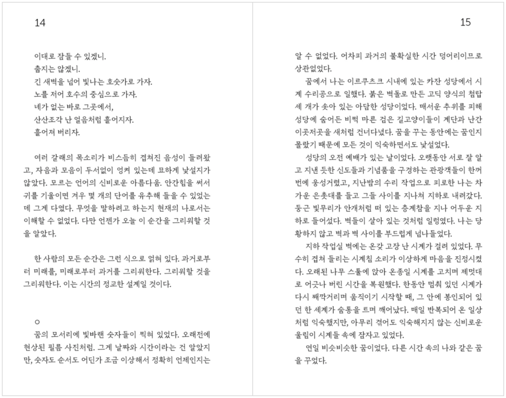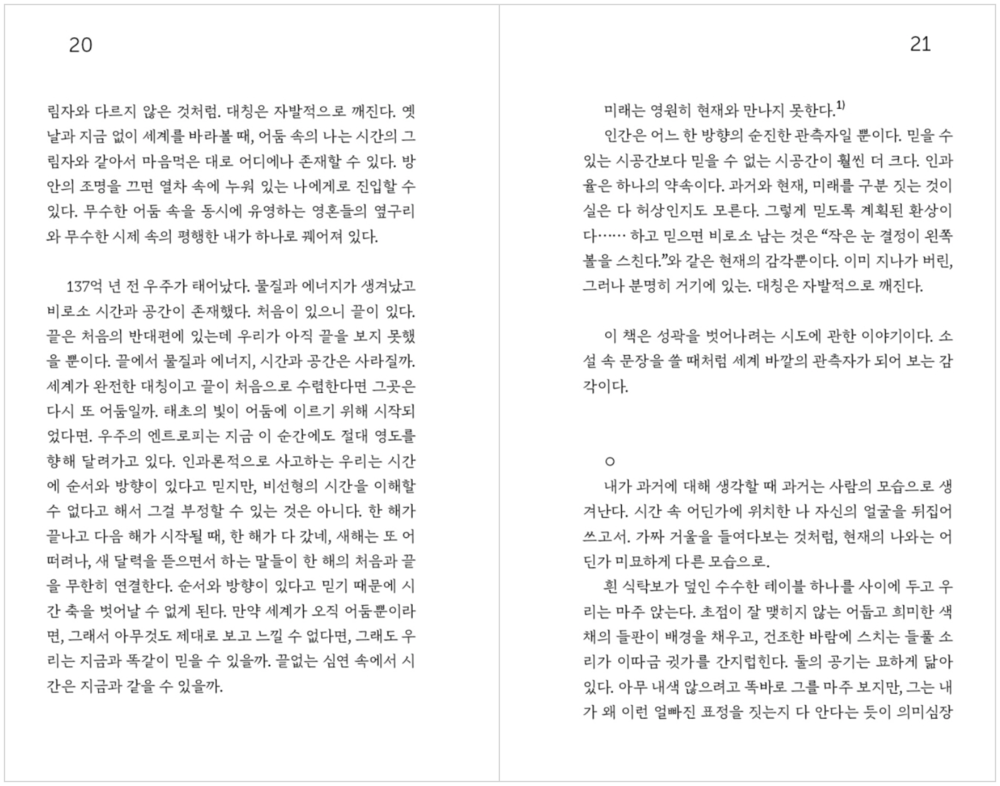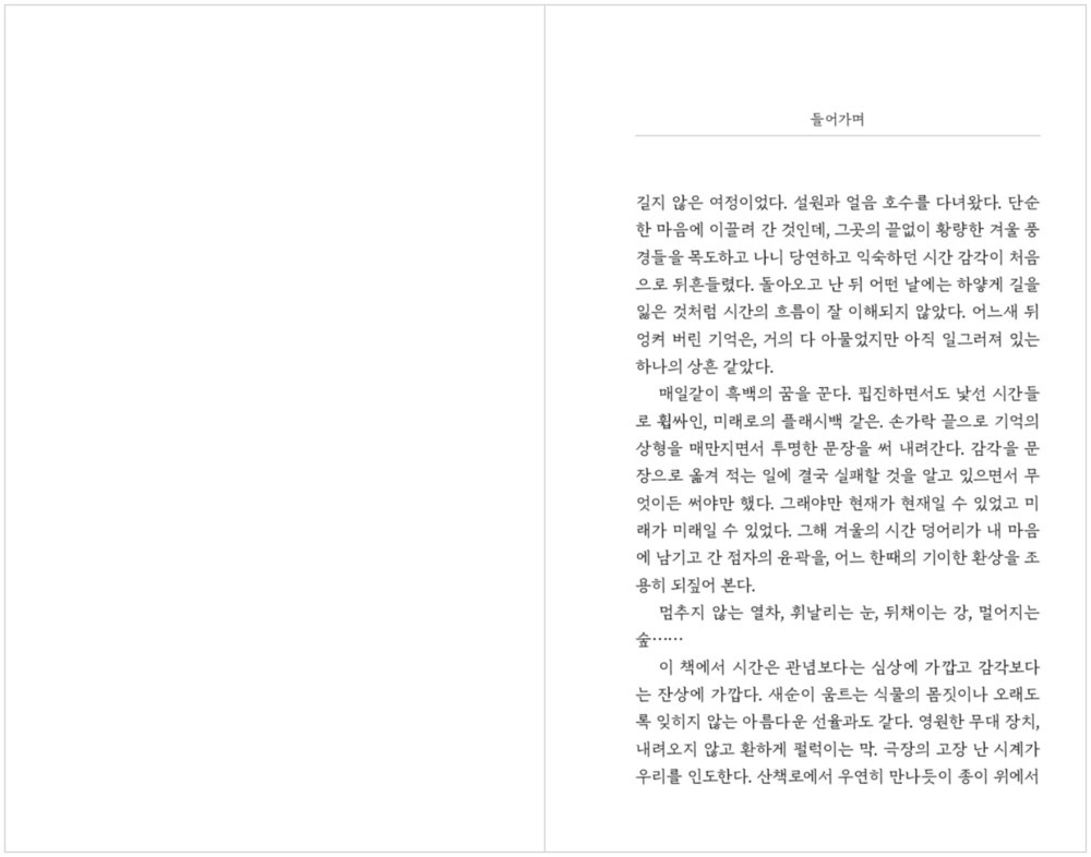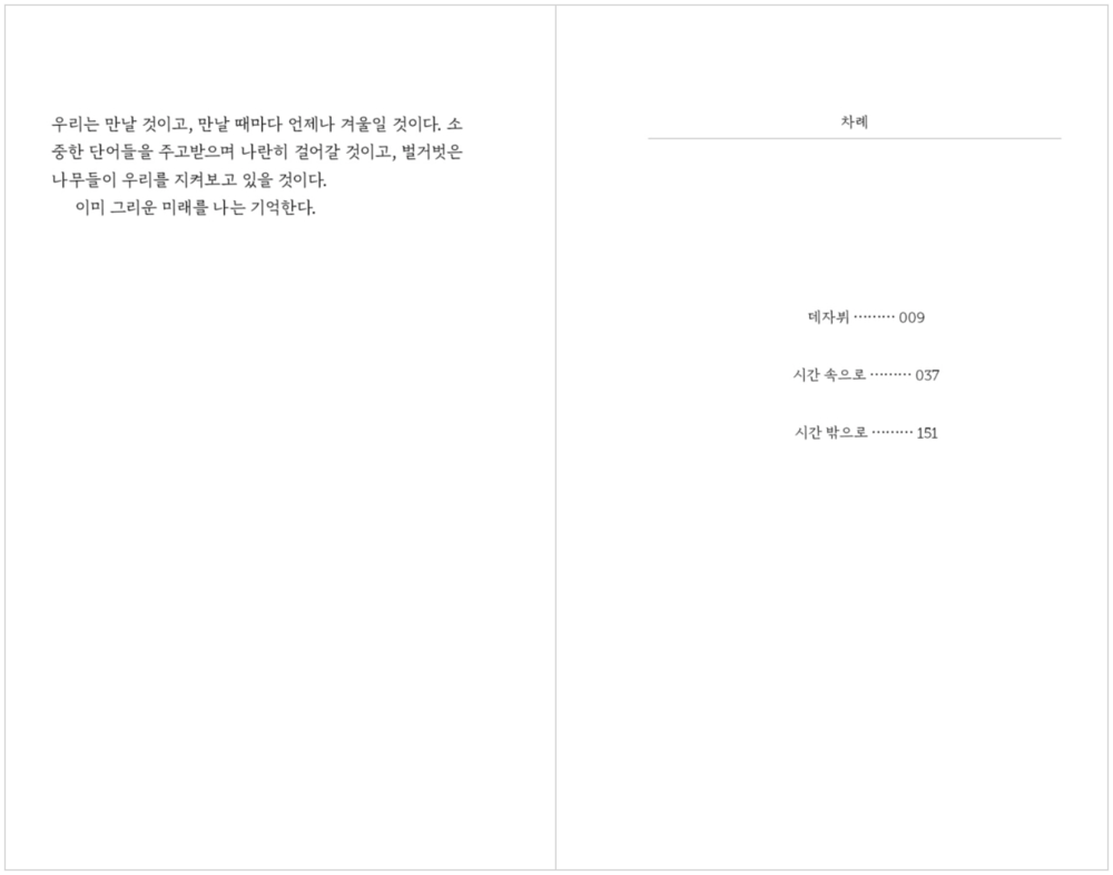 몇 개의 문장을 연달아 쓴 다음 거기서 시제를 지워 본다. 문장 속에서나마 시간의 것이라고 생각되는 울타리의 바깥쪽으로, 우리가 영원이라고 부르는 세계 쪽으로, 간신히, 정말로 간신히 몇 걸음을 내딛어 보는 것이다. 안쪽과 바깥쪽의 시간이 어떻게 다르게 흐르는지 알고 싶어지고, 거기에 있다고 짐작될 뿐인, 보이지 않는 경계를 넘어 조심스럽게 걸어 들어가 본다. 그러면 먼저 내딛은 한쪽 발이 빛의 불길에 새하얗게 타오르기 시작한다.