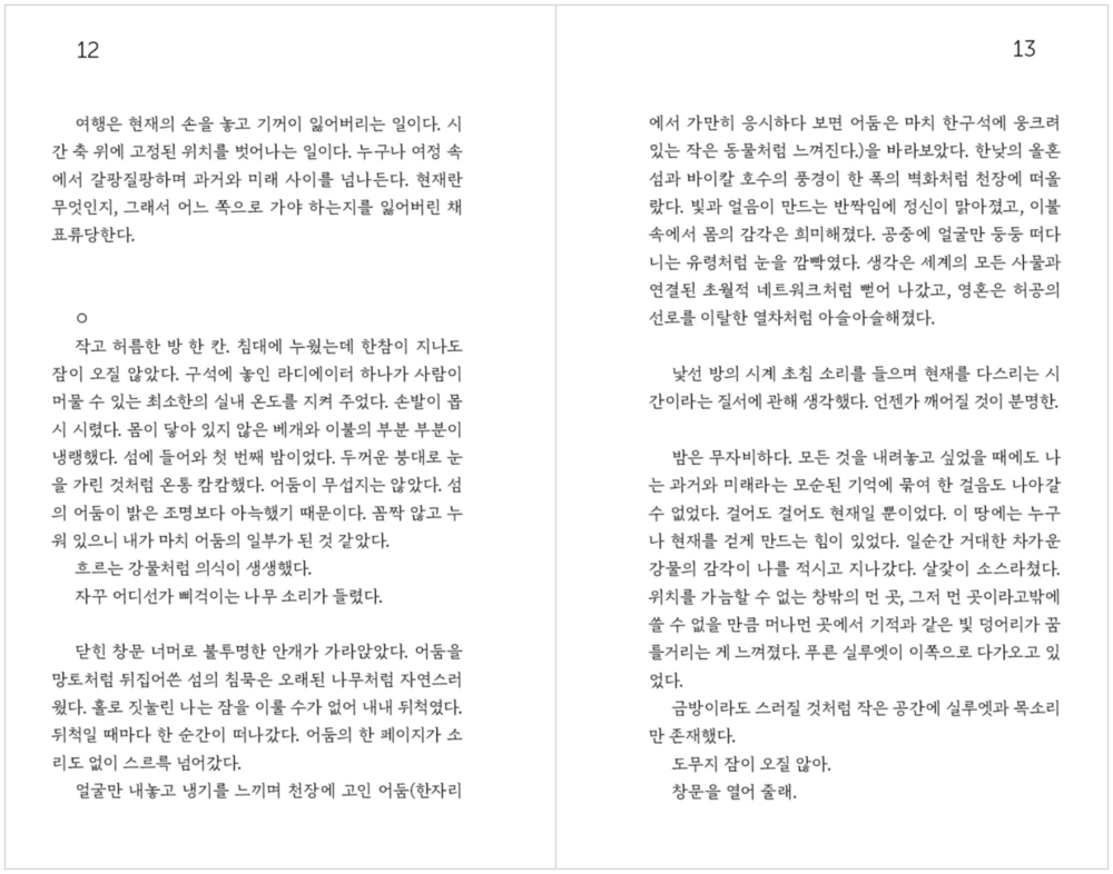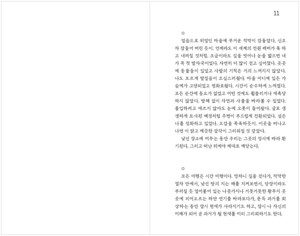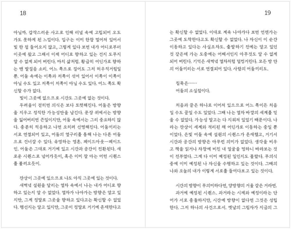 하루의 대부분을 오직 이동하기 위해서 보낸다. 이곳에서 그곳으로, 그곳에서 또 다른 곳으로. 일정 시간이 지나고 나면 그곳이 이곳이 되는 일의 반복. 나는 거의 가만히 있고, 비행기나 열차나 자동차가 움직이는 것이지만 말이다. 이곳이 어디인지, 그리고 지금 향하는 곳이 어디인지는 이 여정에서 별로 중요하지 않다. 정말로 이동하기 위해서 이동하고 있을 뿐이니까. 조금 더 정확히 말하자면, 내가 이 여정을 선택한 이유는 이동하는 시간 자체에 속해 있기 위해서이다. 가능한 한 멈춰 있지 않기 위해서. 끊임없이 나 자신을 앞 으로 던져 나가기 위해서. 순수한 기투를 실감하기 위해서.