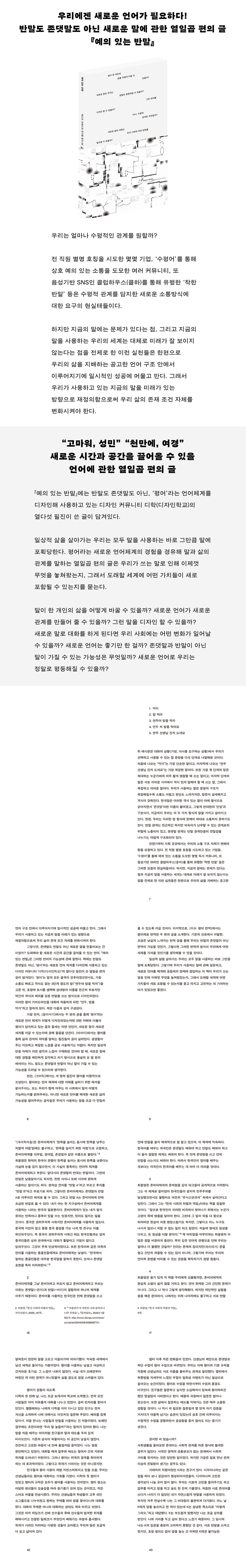 언젠가부터 사회 곳곳에서는 우리의 소통 구조 자체가 변해야 함을 요청하고 있다. 전 직원 별명 호칭을 시도하고 있는 기업들, ‘수평어’를 통해 예의 있는 소통을 도모한 몇몇 독서 커뮤니티, 또 음성기반 SNS인 클럽하우스(클하)를 통해 유행한 ‘착한 반말’ 등은 그러한 요청의 현실태들이다. 하지만, 지금의 말에는 문제가 있다는 점과 지금의 말을 사용하는 세계는 대체로 미래가 잘 보이지 않는다는 점을 전제로 한 이런 실천들은 한편으로 우리의 삶을 지배하는 공고한 언어 구조 안에서 이루어지기에 일시적인 성공에 머물고 만다. 그래서 우리가 사용하고 있는 지금의 말을 미래가 있는 방향으로 재정의함으로써 우리 삶의 존재 조건 자체를 변화시켜야 한다.