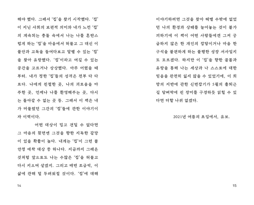 유년 시절부터 지금까지 거쳐온 개인적 공간에 관한 탐구와 에피소드는 비단 나만의 이야기가 아닐 것이다. 살아있는 모든 것에게 발 디딜 곳은 분명히 필요할 테니까. 집을 버린 민달팽이에게도 서식지가 있듯이 우리의 유랑은 이상할 것이 없다.