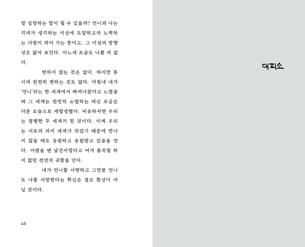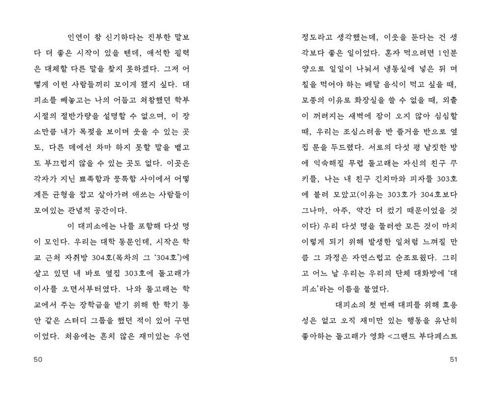 없기도 하고 있기도 한 나만의 비물리적 공간을 모아 1장 '머물렀다가 사라지길 반복하지'를, 집으로 여긴 물리적 공간을 모아 2장 '두 발이 명백히 땅을 딛고 있어'를 구성했다.