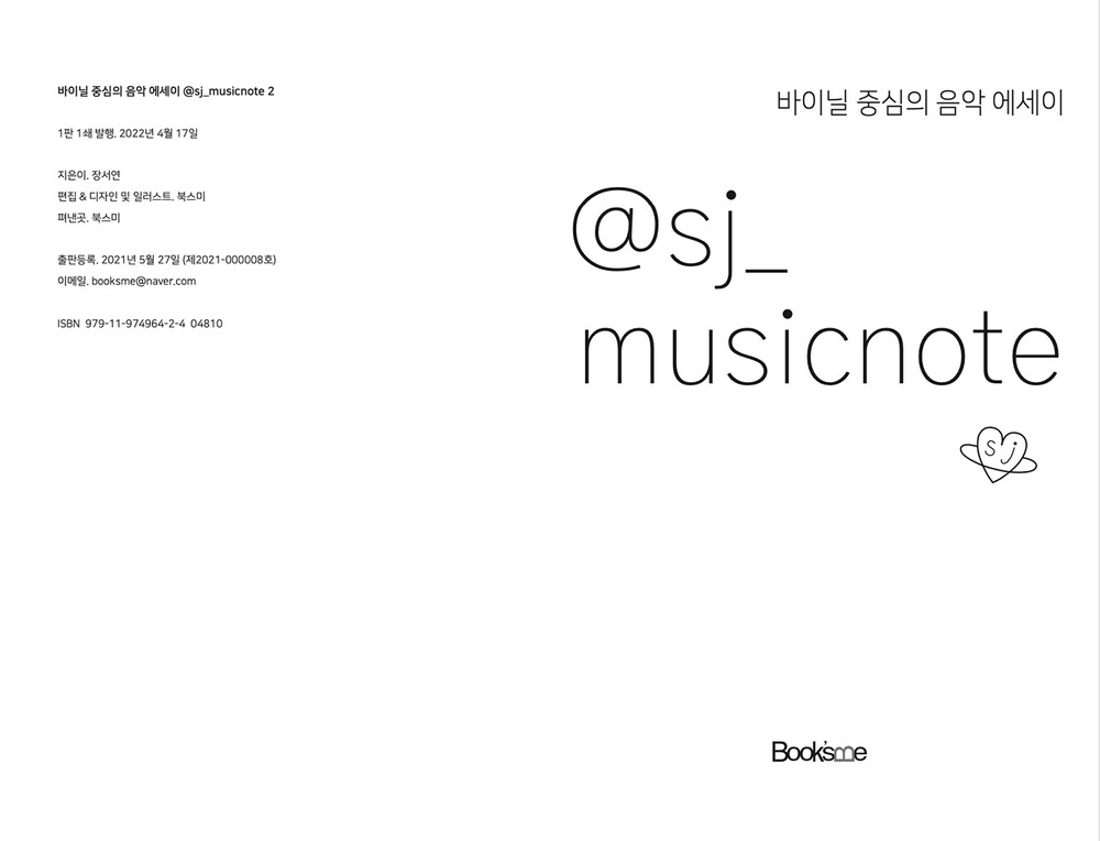 북스미는 2021년 시작된 1인 출판사입니다. 저자 겸 출판인인 sj는 결혼 후 육아를 하며 '경력단절'의 시간을 가졌습니다. 틈틈이 음악 블로그와 인스타그램을 하는 것이 창의적이고자 하는 sj에게 많은 해방감과 에너지 를 가져다주었습니다. 그러던 중 그동안 써온 글들을 책으로 묶어보겠다는 결심을 했습니다. 출판에 관련된 지 식이 없었지만 문예창작학과 출신인 까닭에 출판이란 것이 그리 멀게 느껴지지는 않았습니다. @sj_musicnote 시리즈는 앞으로도 계속 이어질 것입니다. 글을 쓰는 것도, 음악에 대한 애정도, 책임감도, 책 만드는 실력도 모든 것이 조금씩 진화하는 중입니다. 더불어 출판사 북스미는 조금 색다르고 빛나는 책들을 계속해서 출간하고자 합니다. 음악에 관한 책도 좋고, 음악과 관련되지 않은 책도 좋습니다.