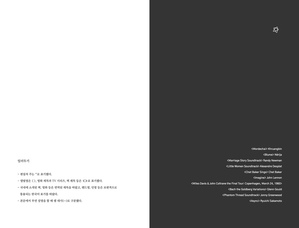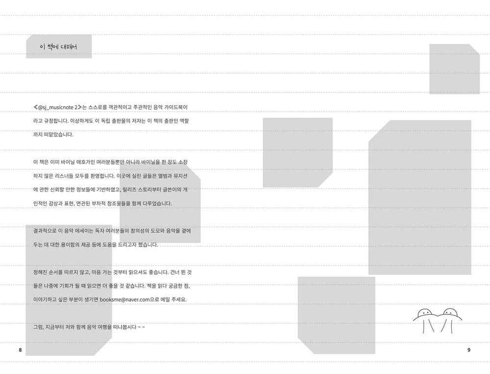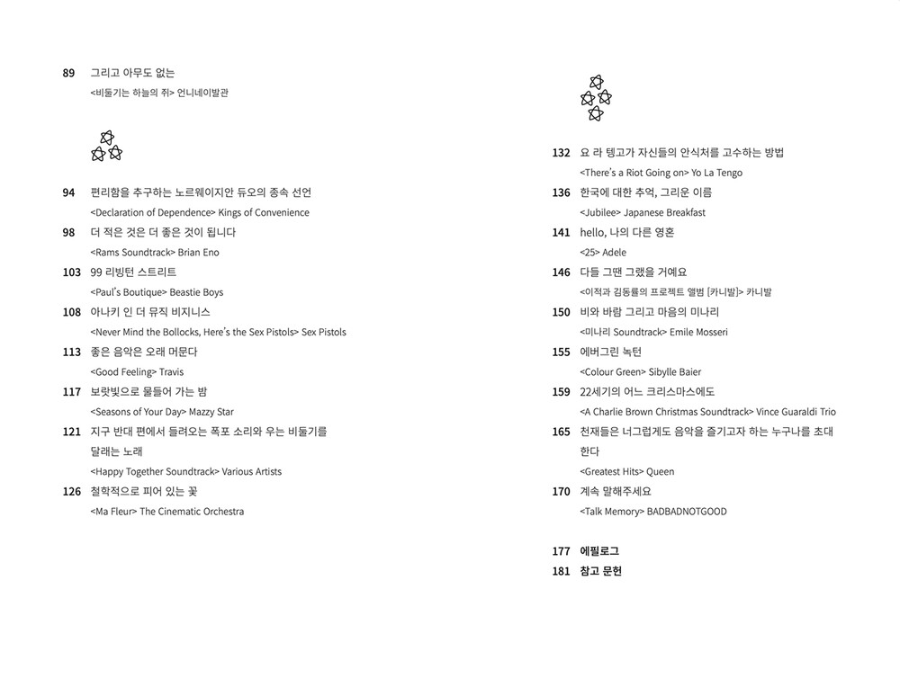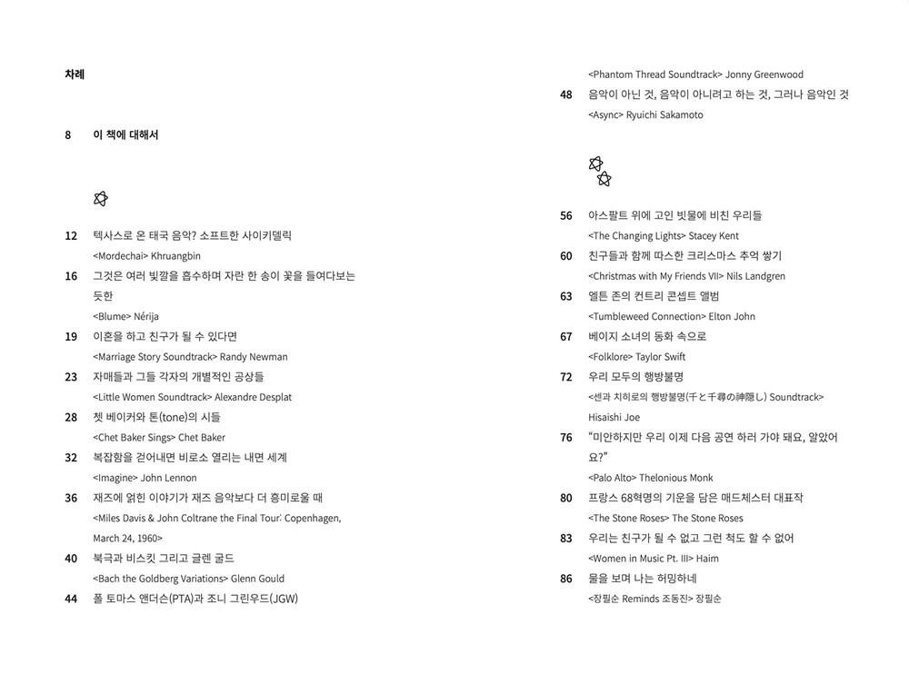 단순히 음악을 즐기는 것을 넘어 보다 면밀히 생각해보는 사유의 즐거움을 누리고, 뮤지션들의 생각을 따라가며 그들의 창의적 생각들을 일상에 빗대어 보기도 합니다. 사소하고 개인적으로 시작되어 마침내 책의 형태를 띄게 된 이 글들이 독자 여러분들께 우연한 손을 내밀 수 있기를 바랍니다.