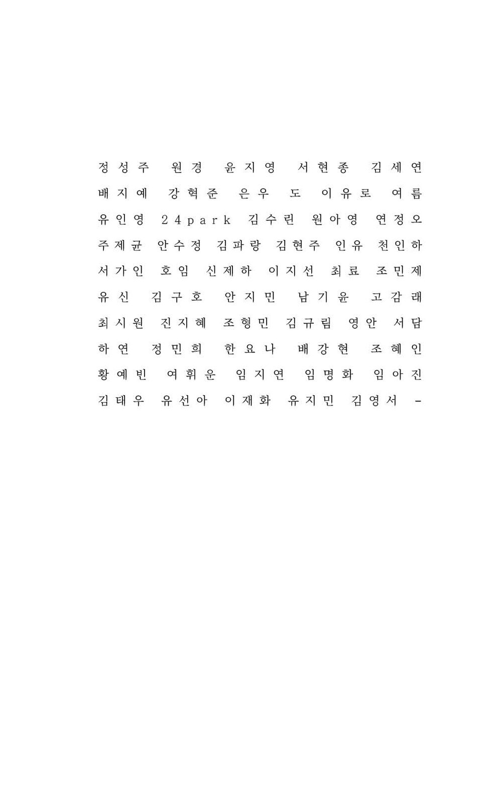 정성주 원경 윤지영 서현종 김세연 배지예 강혁준 은우 도 이유로 여름 유인영 24park 김수린 원아영 연정오 주제균 안수정 김파랑 김현주 인유 천인하 서가인 호임 신제하 이지선 최료 조민제 유신 김구호 안지민 남기윤 고감래 최시원 진지혜 조형민 김규림 영안 서담 하연 정민희 한요나 배강현 조혜인 황예빈 여휘운 임지연 임명화 임아진 김태우 유선아 이재화 유지민 김영서