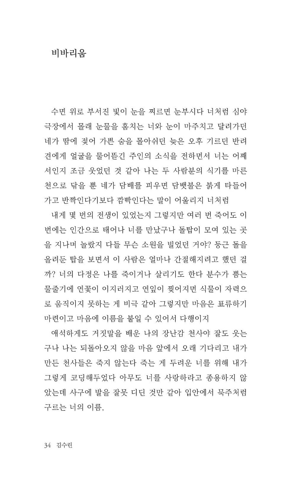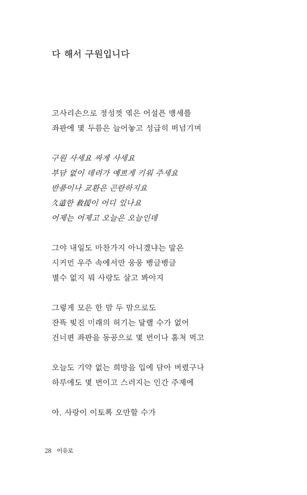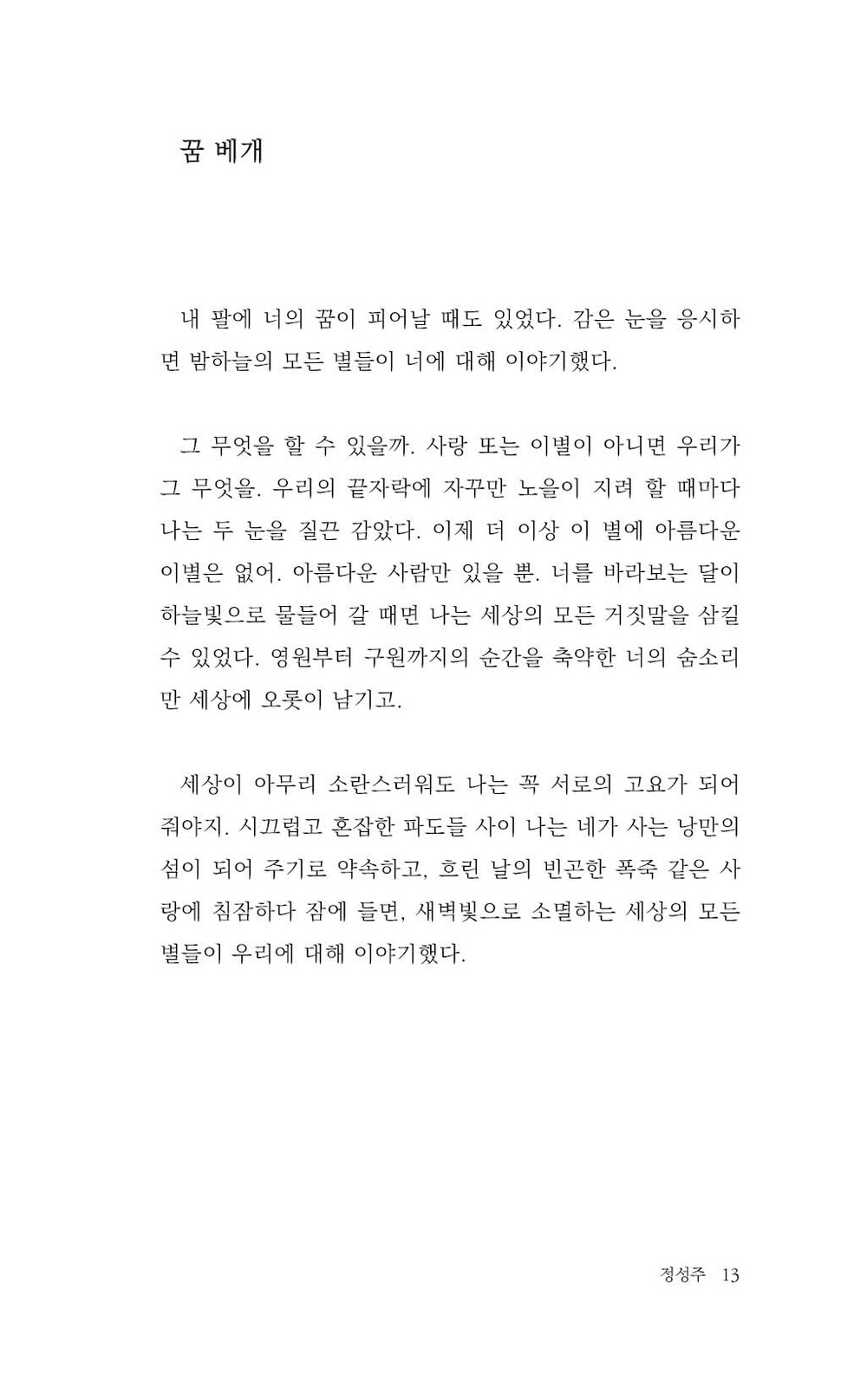 세상이 아무리 소란스러워도 나는 꼭 서로의 고요가 되어 줘야지. 시끄럽고 혼잡한 파도들 사이 나는 네가 사는 낭만의 섬이 되어 주기로 약속하고, 흐린 날의 빈곤한 폭죽 같은 사랑에 침잠하다 잠에 들면, 새벽빛으로 소멸하는 세상의 모든 별들이 우리에 대해 이야기했다.