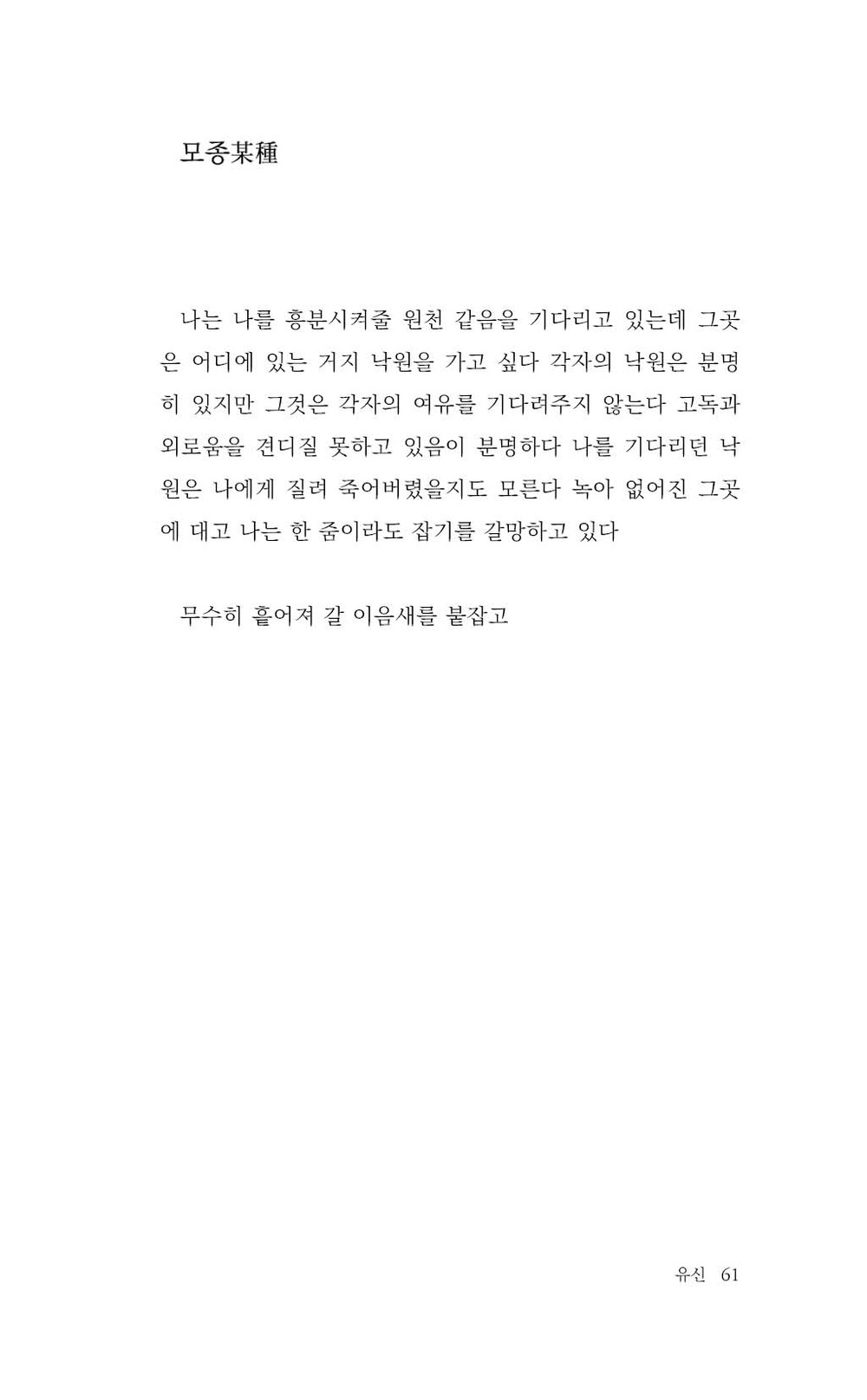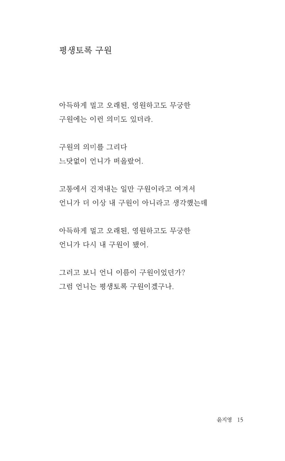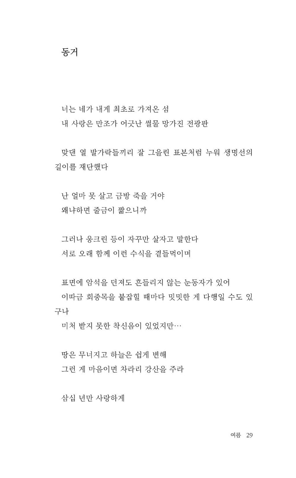 다만 기쁨을 주소서. 내게 안락한 잠을 주소서. 고작 하나 남긴 자정을 넘기소서. 숨죽이고 원이 차길 기다려 기다려, 실오리 같은 희망希望이 차길 기다려 기다려, 구九에서 일日을.구舊에서 일一을. 구원久遠에서 구원救援을.
