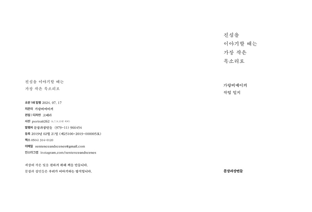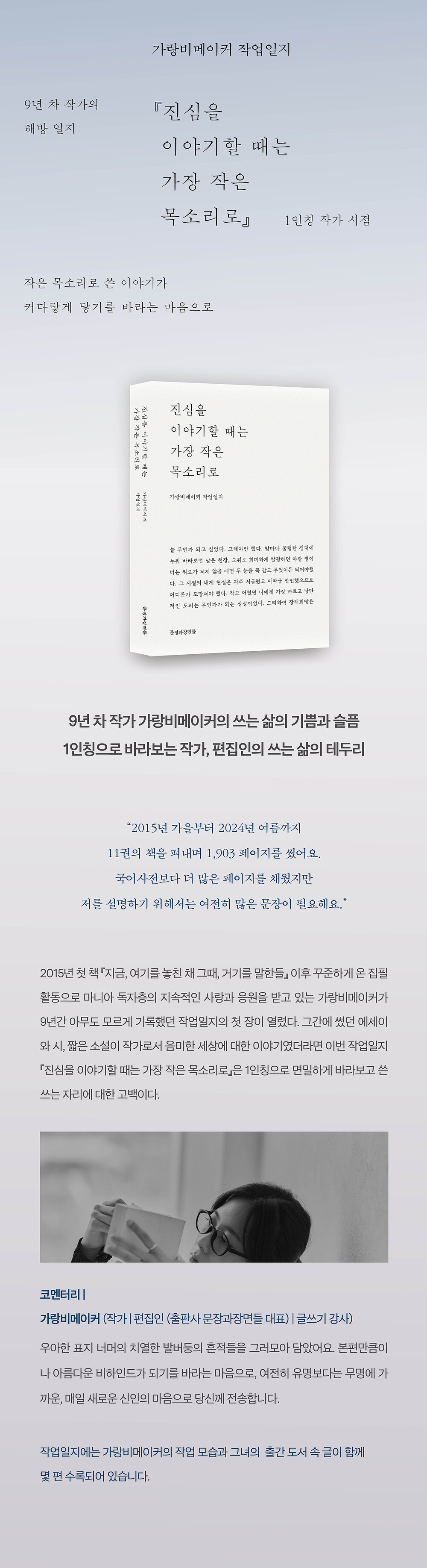 2015년 첫 책 『지금, 여기를 놓친 채 그때, 거기를 말한들』 이후 꾸준한 집필 활동으로 마니아 독자층의 지속적인 사랑과 응원을 받고 있는 가랑비메이커가 9년간 아무도 모르게 기록했던 작업일지의 첫 장이 열렸다. 그간에 썼던 에세이와 시, 짧은 소설이 작가로서 음미한 세상에 대한 이야기였더라면 작업일지 『진심을 이야기할 때는 가장 작은 목소리로』은 1인칭으로 면밀하게 바라보고 쓴 쓰는 자리에 대한 고백이다.