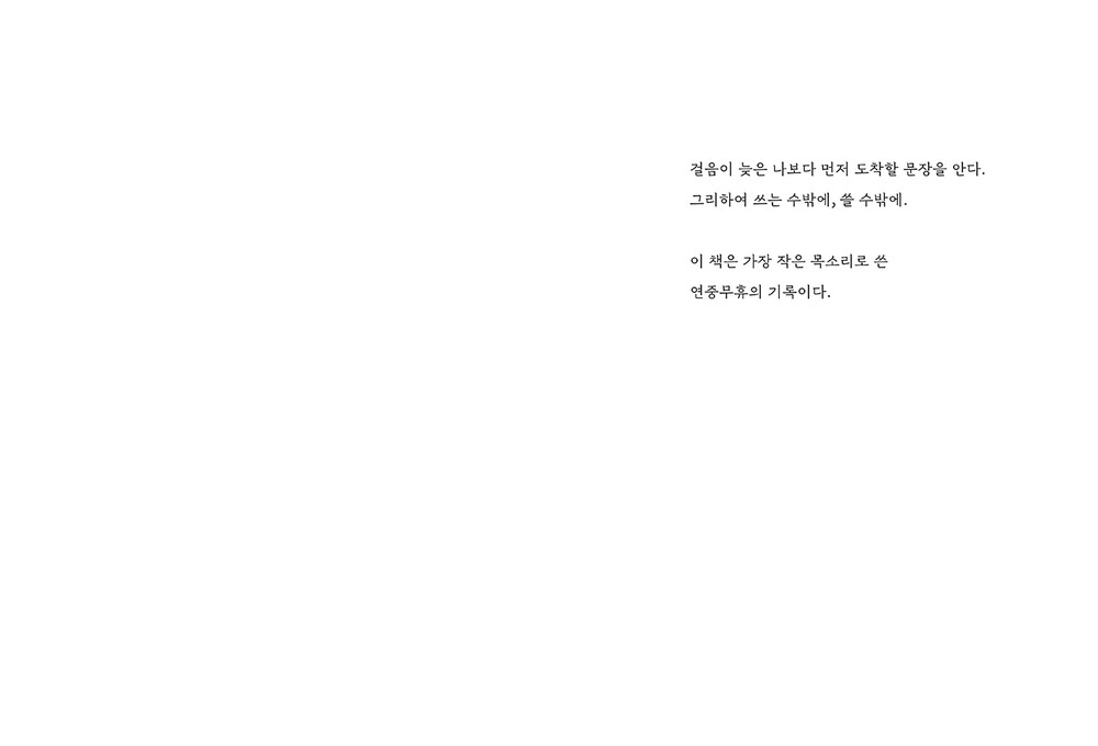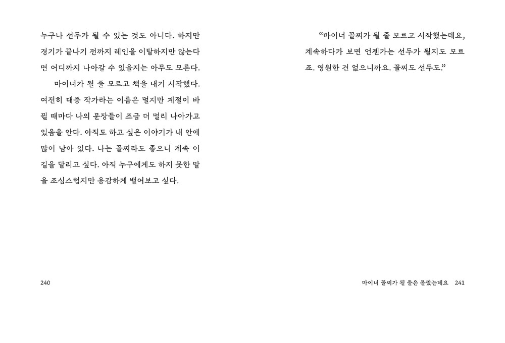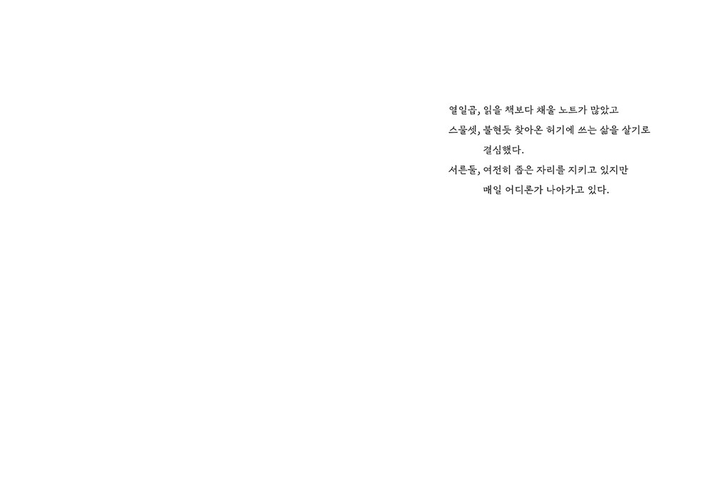 잔잔한 인지도와 예측 가능한 범위의 성과.’ 의연하게 살아가고 있다지만 지루한 것을 잠시도 견디지 못하는 내가 매일 같은 자리에 앉아서 성실하게 치열하게 발버둥치며 써낸 시간들이 가끔은 꼴찌의 성실함처럼 덧없이 느껴질 때가 있다.”