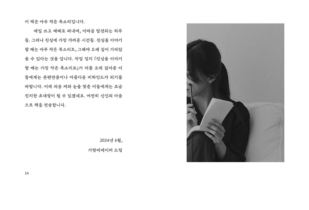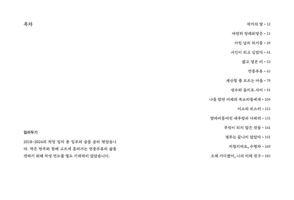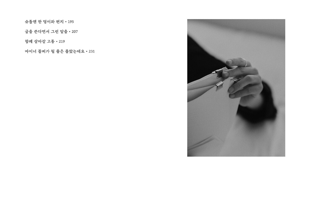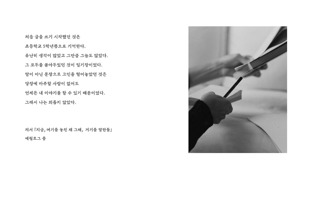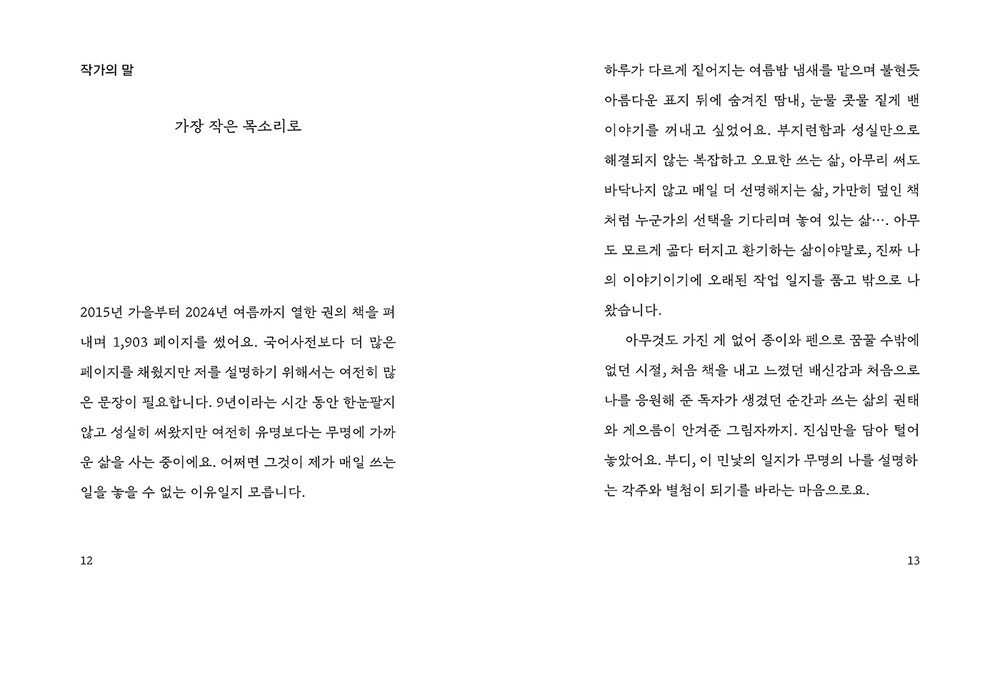 “2015년 가을부터 2024년 여름까지 열한 권의 책을 펴내며 1,903 페이지를 썼어요. 국어사전보다 더 많은 페이지를 채웠지만 저를 설명하기 위해서는 여전히 많은 문장이 필요합니다.”