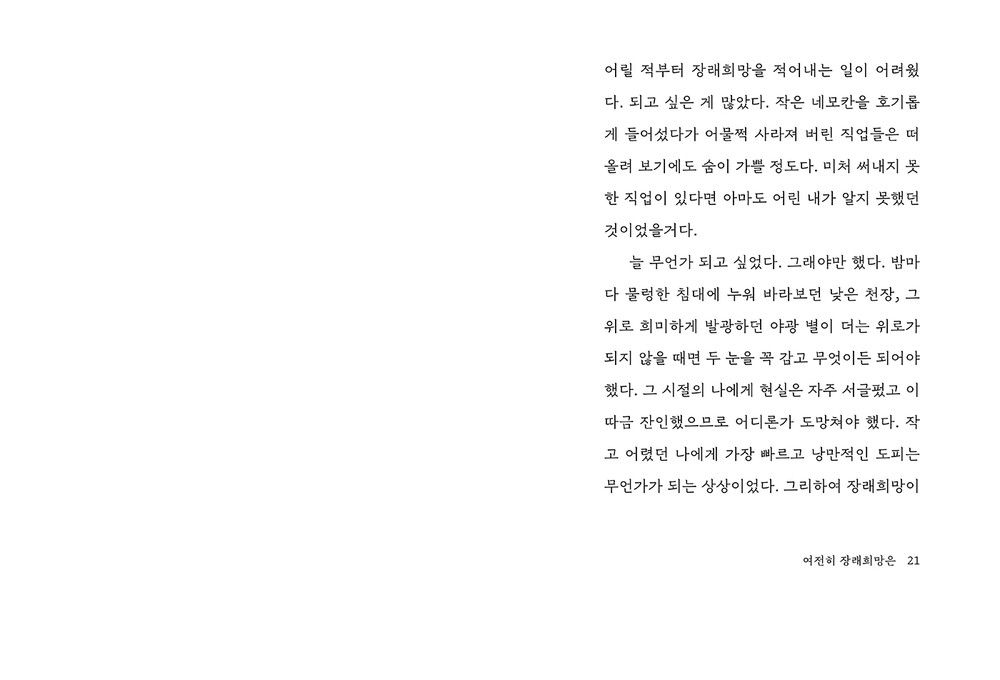 늘 무언가 되고 싶었다. 그래야만 했다. 밤마다 물렁한 침대에 누워 바라보던 낮은 천장, 그 위로 희미하게 발광하던 야광 별이 더는 위로가 되지 않을 때면 두 눈을 꼭 감고 무엇이든 되어야 했다. 그 시절의 나에게 현실은 자주 서글펐고 이따금 잔인했으므로 어디론가 도망쳐야 했다. 작고 어렸던 나에게 가장 빠르고 낭만적인 도피는 무언가가 되는 상상이었다. 그리하여 장래희망이 아닌 장래희망‘들’로 비좁던 네모칸에는 꿈과 희망의 반짝거림보다도 녹록하지 않은 현실을 잊기 위한 필사의 바람들이 채워졌다.