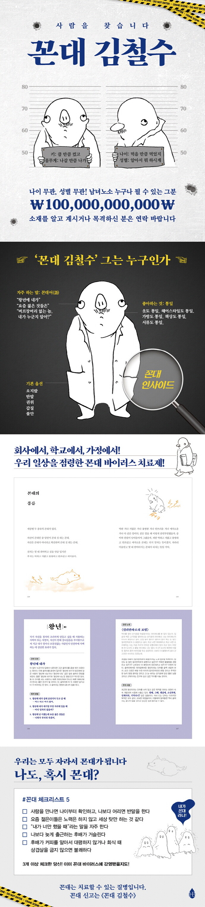 카피라이터 정철의 '아프지만 유쾌한 꼰대 꼬집기'. 꼰대, 더 이상 남의 이야기가 아니다. 꼰대에는 나이도 성별도 따로 없다. 수직적 서열 문화가 깊게 뿌리내린 이 사회에 어느새 적응한 우리는 누구든 방심하면 꼰대 김철수가 될 수 있는 것이다. 자칭 '가끔 꼰대, 아니 자주 꼰대'라는 카피라이터 정철이 바로 그분, 꼰대 김철수를 말하기로 했다.
