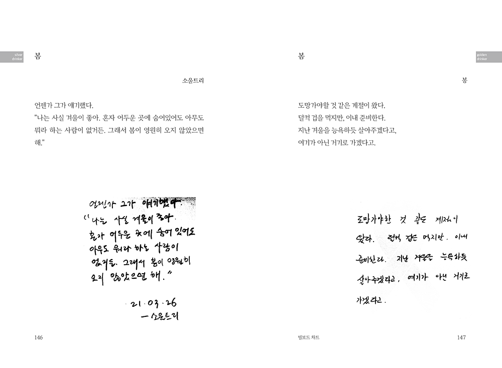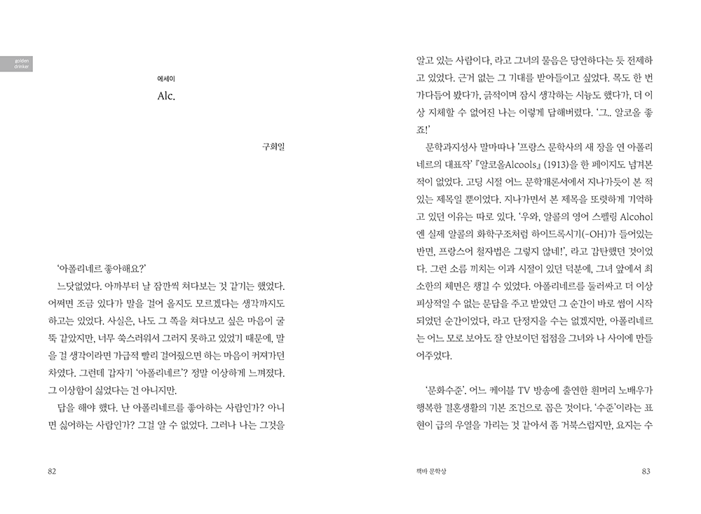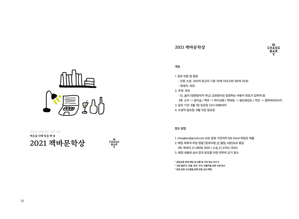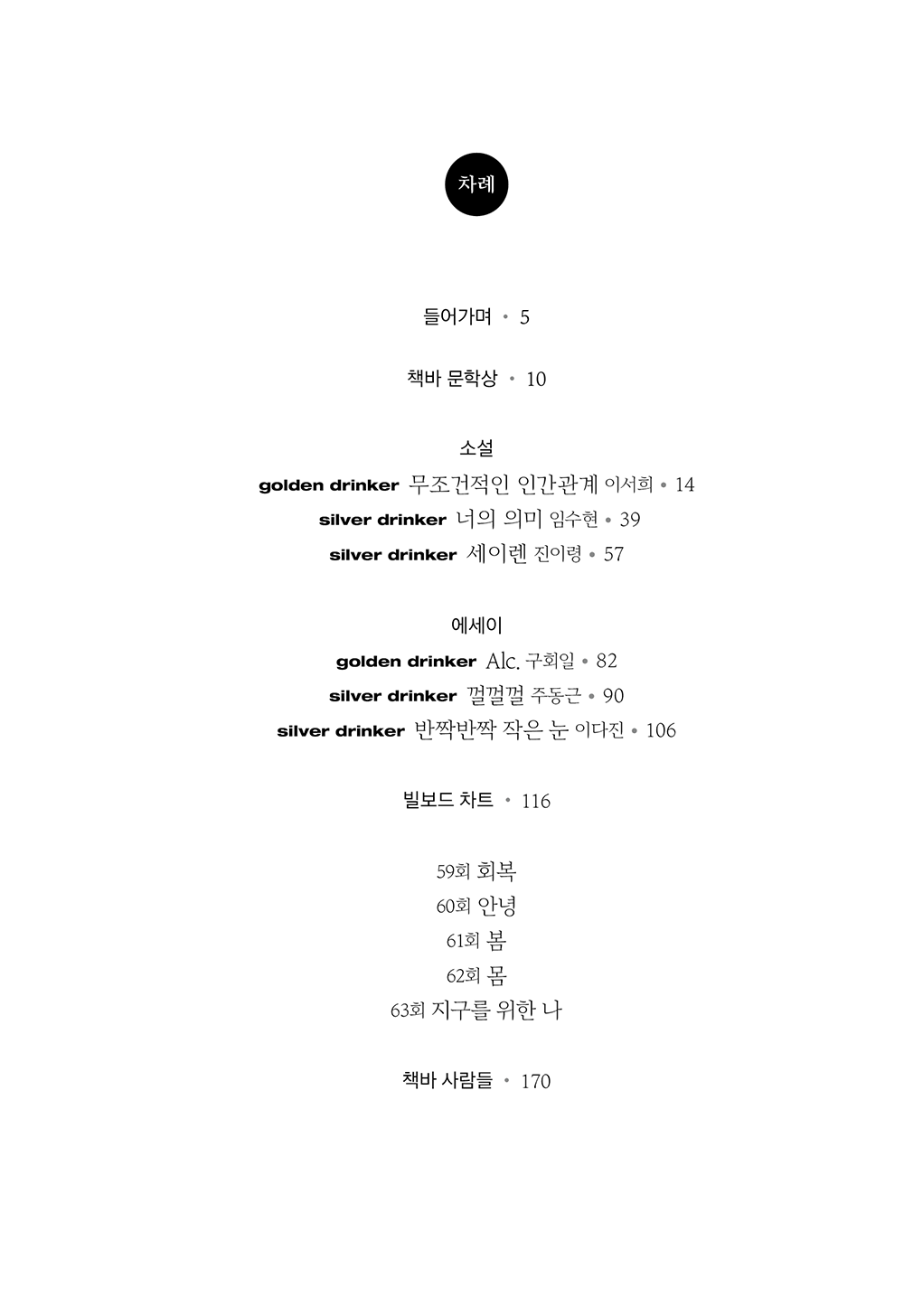 애주가들이 참여하는 책바 문학상은 소설과 에세이 분야로 글을 받고 1차,2차, 3차 심사를 거쳐 수상자를 선정합니다. <2021 책바 문학상>의 원칙은 작품 내에 반드시 술에 대한 이야기가 포함되어야 한다는 것입니다. 책에는(일반 공모전의 대상과 우수상에 해당되는) 골든 드링커, 실버 드링커의작품이 게재되었습니다.