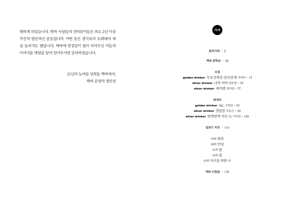 책은 1) 책바 문학상, 2) 빌보드 차트, 3) 책바 사람들 세 가지 구성으로이뤄졌습니다.
