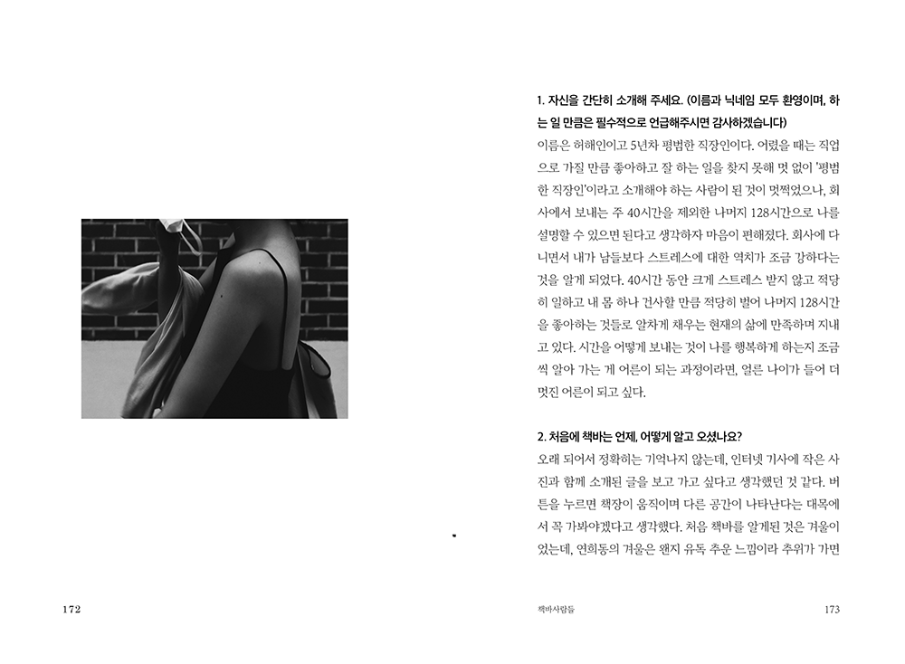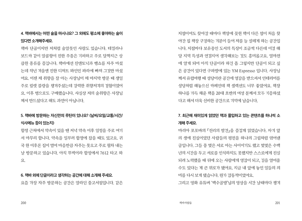 책바의 단골 손님들에 대한 인터뷰집입니다. 책바의 단골 손님들은 책과술을 동시에 즐기는 낭만을 알고, 각자만의 뚜렷한 취향을 가지고 있다고생각합니다. 이들을 다른 분들에게도 소개하고 싶었어요. 책바의 오랜단골(2년 이상 꾸준히 방문) 여덟 분을 추려서 서면 인터뷰 형식으로 10개의동일한 질문을 던져 답변을 받았습니다.