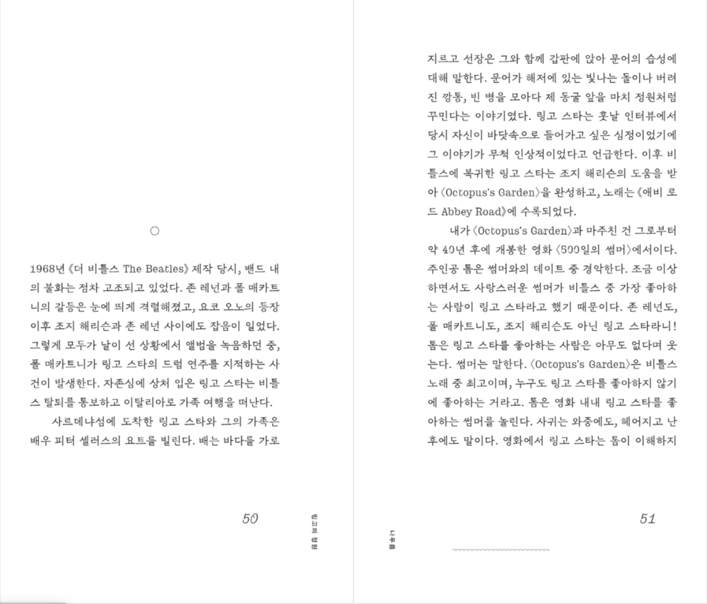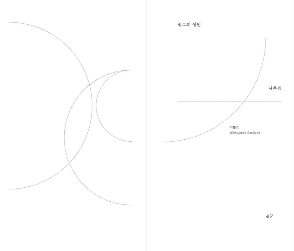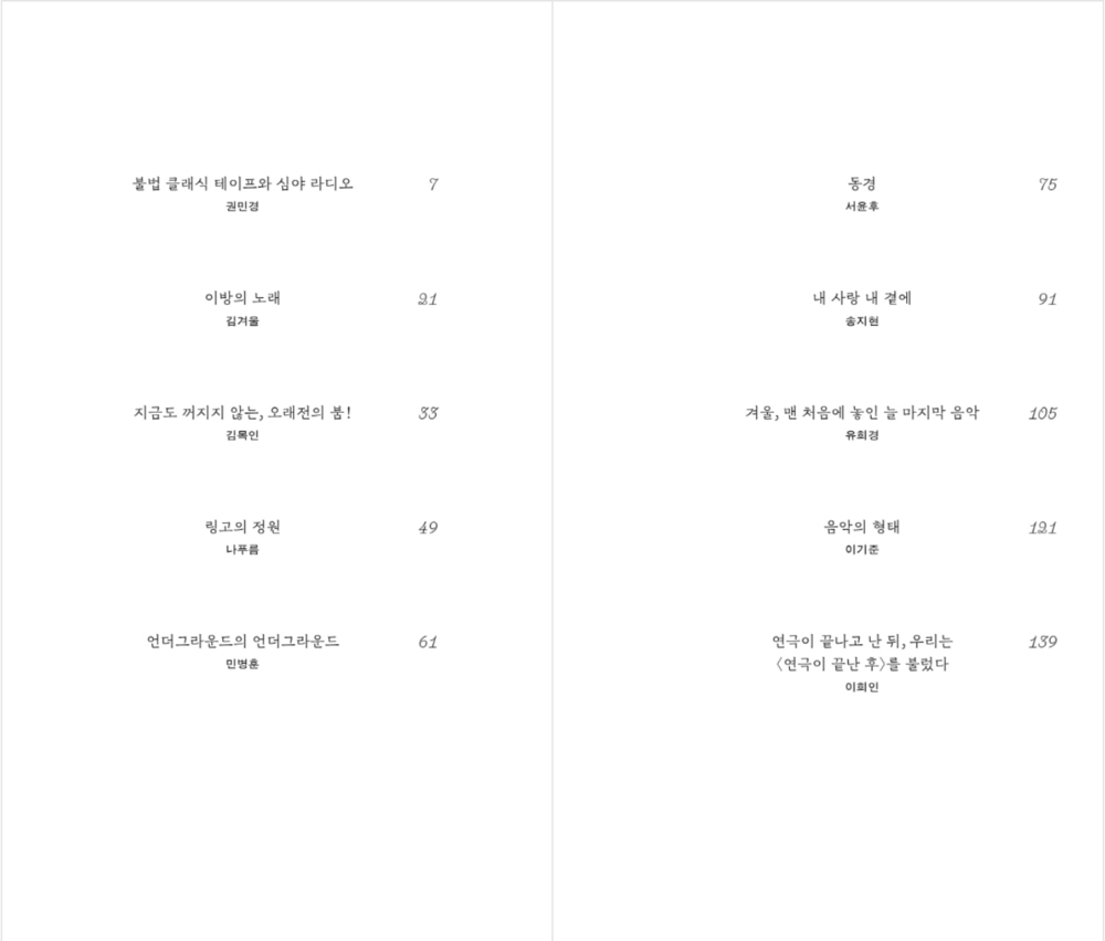 아름다운 작품으로 세상을 빛내는 작가와 시인, 뮤지션과 디자이너 등이 모여 우리가 이미 알고 있던 음악에 인생이라는 서사를 부여했다. 그들이 한 글자 한 글자 써 내려간 이야기를 읽다 보면 자칫 흘러가버리기 쉬운 유행가들이 가슴속에 수놓아지는 것 같은 감각에 사로잡힌다.
