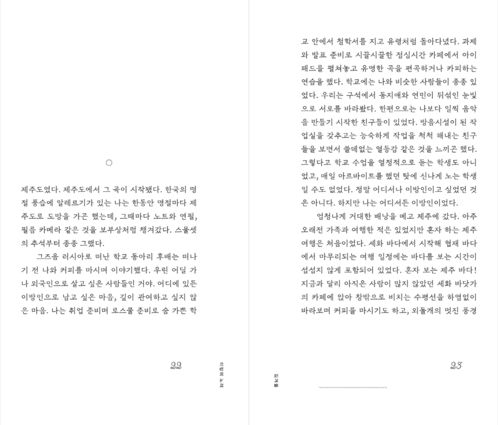 어디서나 이방인이고 싶었던 것은 아니지만 어디서든 이방인이었던 시절, 도망치듯 떠났던 제주의 어느 바다에서 멜로디가 떠올랐다. 첫 곡이라서, 친구와 함께 만들어서, 돈을 벌겠다는 생각이 없어서 느낄 수 있었던 감정들, 살면서 단 한 번 가질 수 있는 그것 속에서 그는 조금도 이방인이 아니었다.