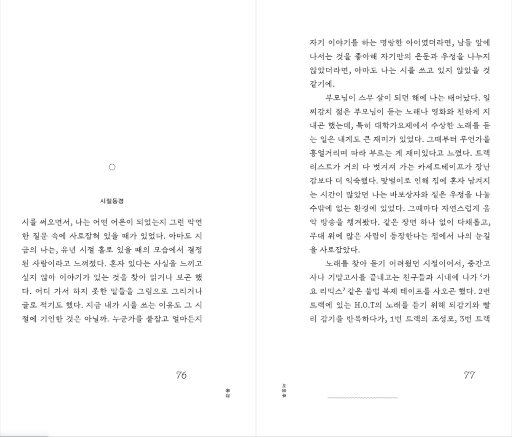 그때 그에게 음악은 동경이었다. 그는 그가 할 수 없는 것을 바라보는 것이 좋았다. 동경하는 방식이나 방향, 혹은 대상이 같으면 기뻐했다. 관념적이고 추상적인 개념을 구체적으로 기억하고 싶었던 그에게 그가 동경하는 대상은 꿈이나 희망이라는 개념의 구체적인 사람이었다. 그 사람의 노래와 삶의 궤적은 초조한 그를 달래고 위로하고 건강하게 했다.