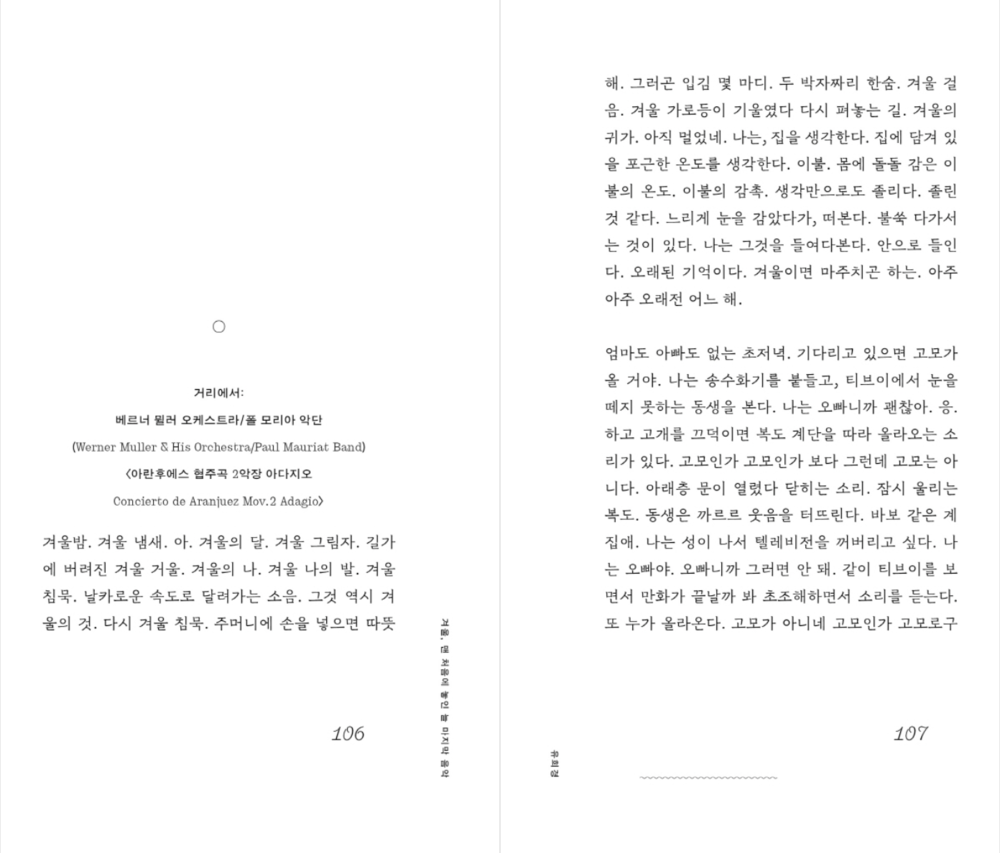그에게 음악은 한 시절을 끝내고 한 시절을 시작하는 시그널이었다. 어느 해의 겨울, 그는 누군가 제목을 일러준 노래를 닿도록 들었다. 누군가 알려준 것과 자신이 듣고 있는 것 사이 어떤 닮음이 있는지도 알려 하지 않고 더는 들을 수 없을 때까지 그 노래를 들었다. 그리고 거짓말처럼 다시는 그 음악을 듣지 않았다. 그해의 풍경은 뚝, 하고 끊어졌다.