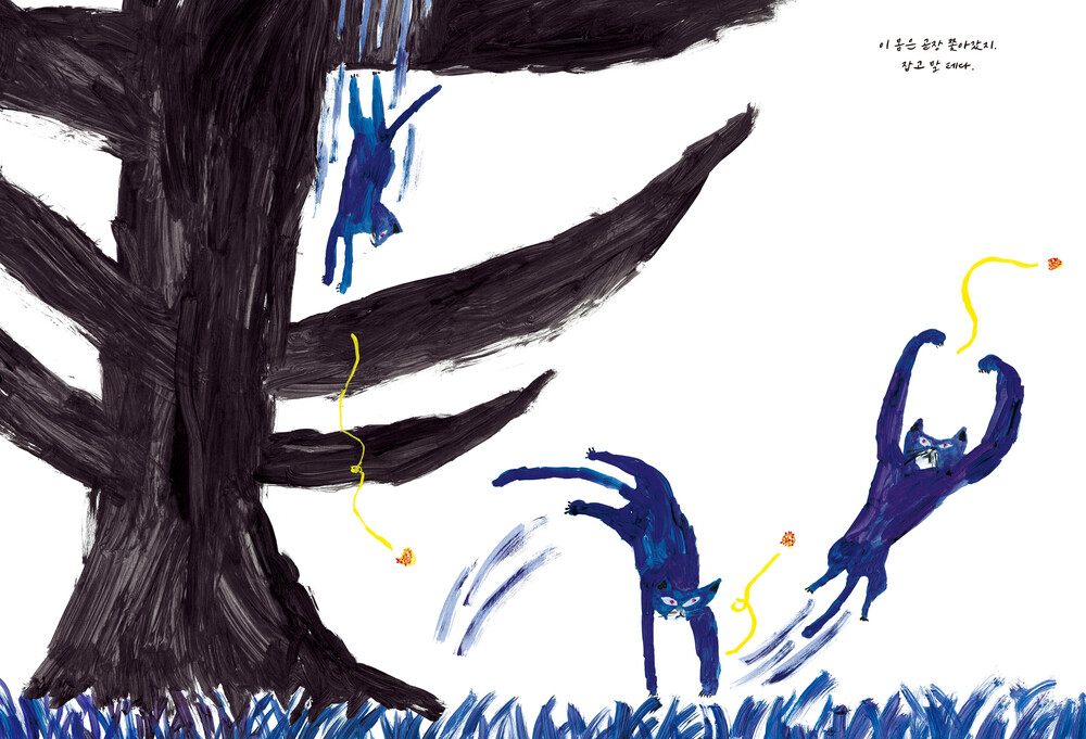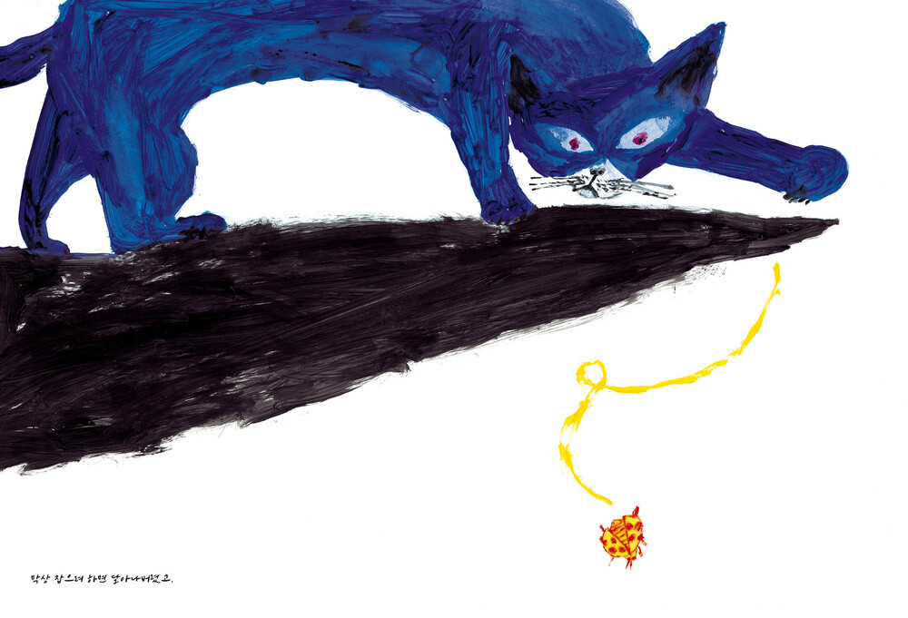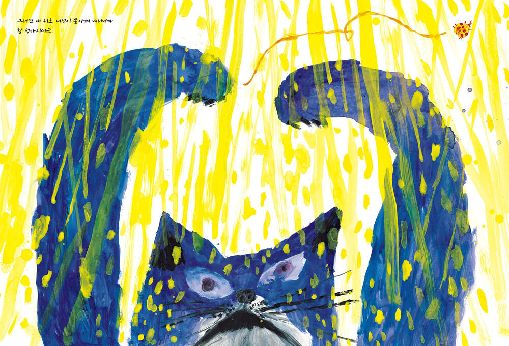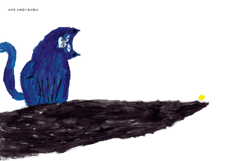 애초에 빛깔이라는 것은 무엇일까요. 태양이나 고온의 물질에서 발하는 빛을 받으면 그 파장에 따라 하나의 물체는 특유한 빛을 띠게 됩니다. 결국 빛깔은 외부라는 세계를 흡수하거나 튕겨내면서 자아를 이루어가는 우리 자신을 은유하기 가장 적합한 도구인지 모릅니다. 그러므로 한 마리 고양이가 노랑을 잡으려는 시도는, 봄을, 계절을, 걷잡을 수 없는 외부를 붙들고 통제하려는 욕망에서 싹튼 것이고, 그 시도는 우리가 알다시피 달성하기 꽤 어려운 것에 속합니다. 그럼에도 외부를 붙들고 이해하고자 하는 마음이 나의 윤곽에 같은 색채를 입혀준다면... “그 이후로 나랑 노랑은 꽤 사이가 좋은 편이야.”라는 푸른 고양이의 마지막 혼잣말은 빛깔을 끌어안지는 못할지언정 훌륭히 채색된 존재의 근사한 경지를 보여줍니다.