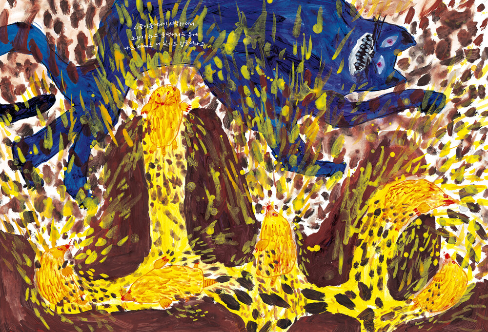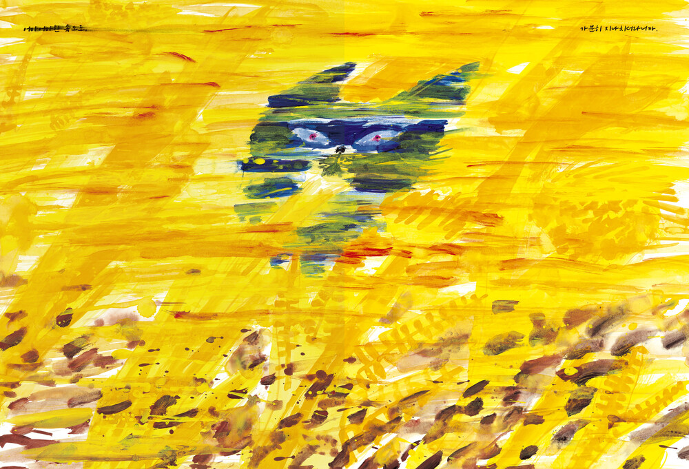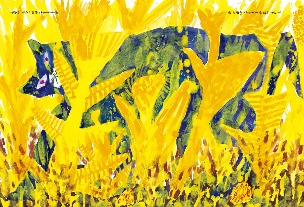 “노란빛으로 얼룩져 춤추듯 그렸다.”고 이 책의 작가 미로코마치코는 말합니다. 이 책은 읽는 것이 아니라 보는 체험을 제안하는 작품입니다. 한번 보면 잊을 수 없을 정도로 압도적이고 원시적인 에너지를 가진 생물들은 미로코마치코의 선과 색으로 전달되지만, 정작 화가의 붓놀림 속에도 완전히 갇히지는 않습니다. 그림책 속 텍스트에는 글로 된 묘사보다는 의성어가 난무합니다. 책 너머로 냄새와 소리, 분위기가 꿈틀대며 보는 이의 몸속으로 들어오는 것만 같죠, 그것도 머리카락이 휘날릴 정도로 빠르게.