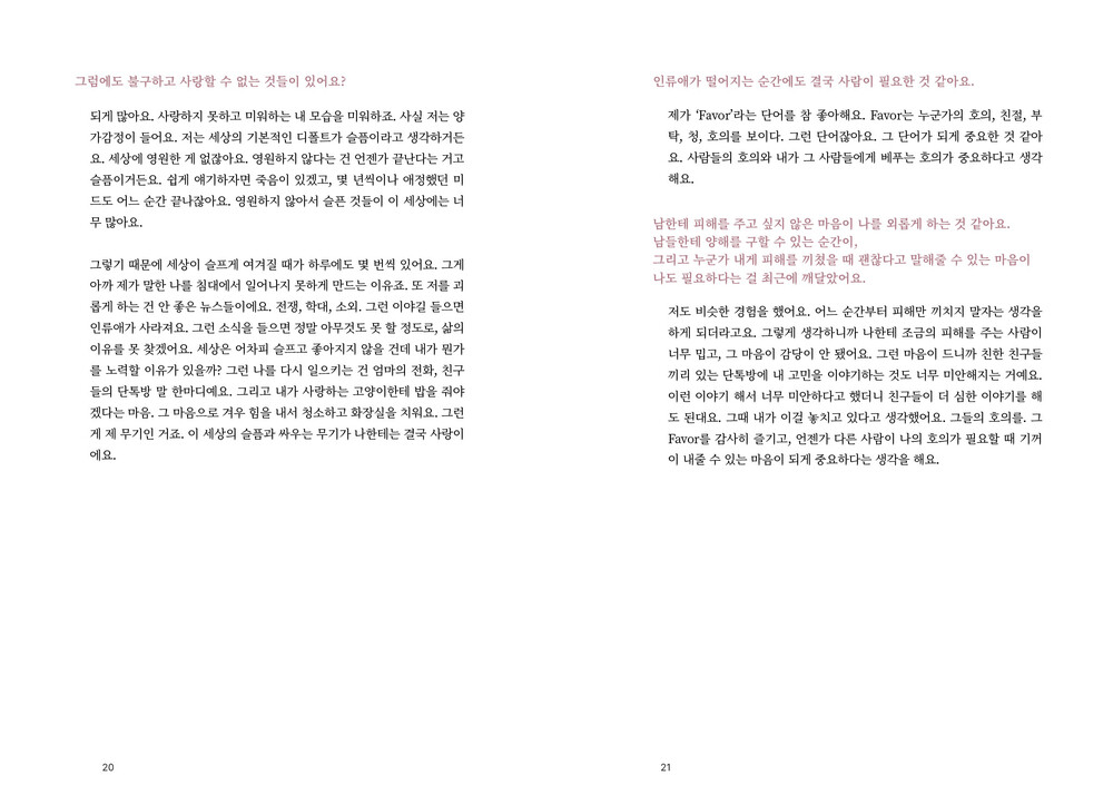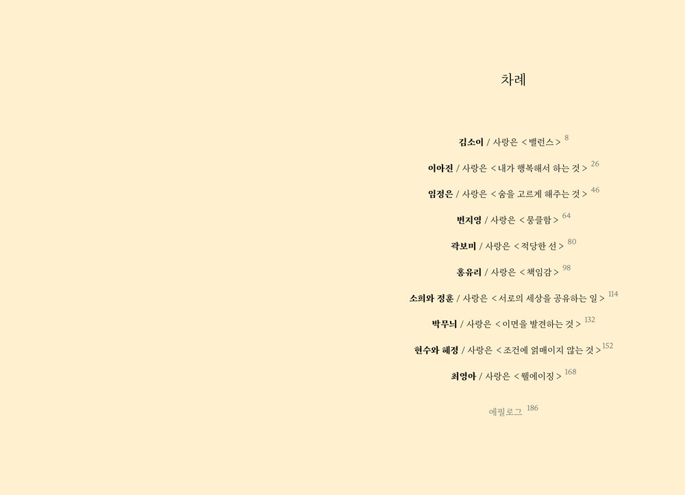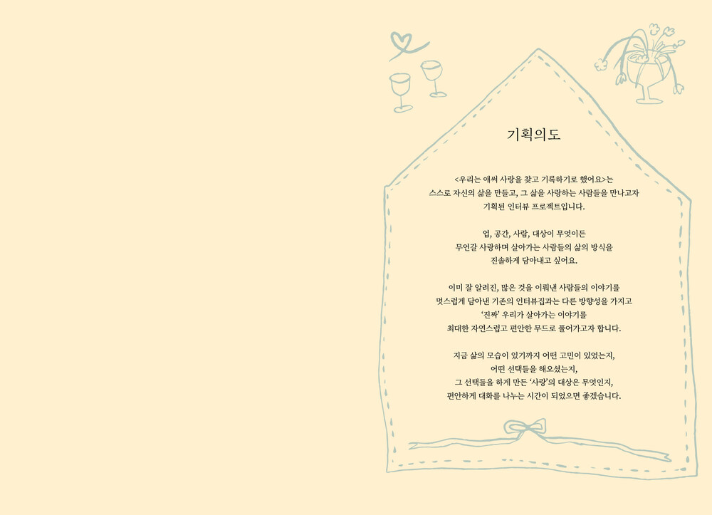 연애 예능이 인기를 얻고, 데이팅 어플의 사용량은 늘어나는데, 그렇게 사랑을 찾는 사람들은 많아지는데 이상하게 사람들은 점점 더 외로워한다는 생각이 들었어요. 오히려 서로를 혐오하는 일에 더 익숙해진 것 같았습니다. 그래서 미디어 바깥, 자극적이지 않은 '진짜' 사랑 이야기를 담고자 했습니다. 대상이 무엇이든 삶의 무언가를 진심으로 사랑하고, 그렇게 잘 살아가는 사람들의 이야기를 담았습니다.