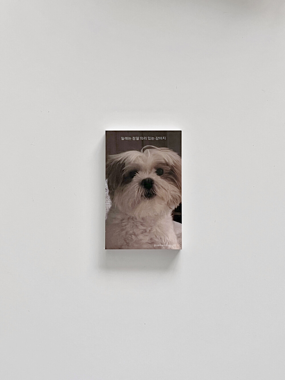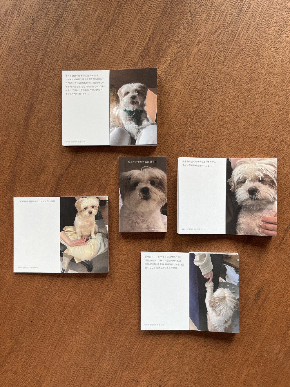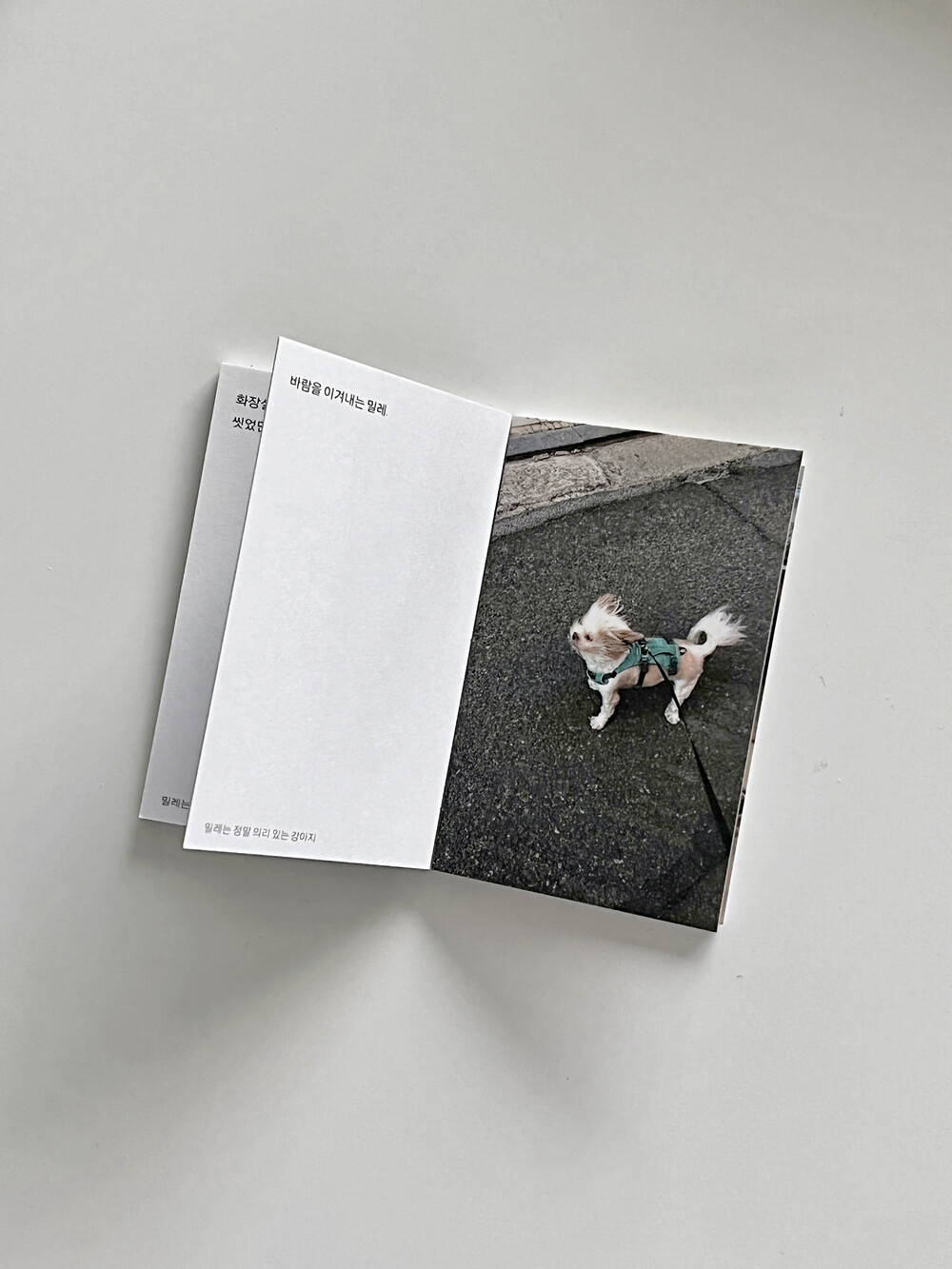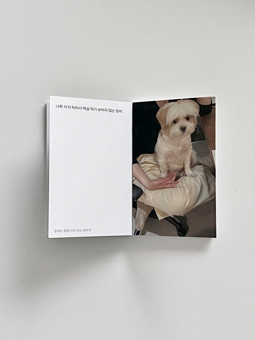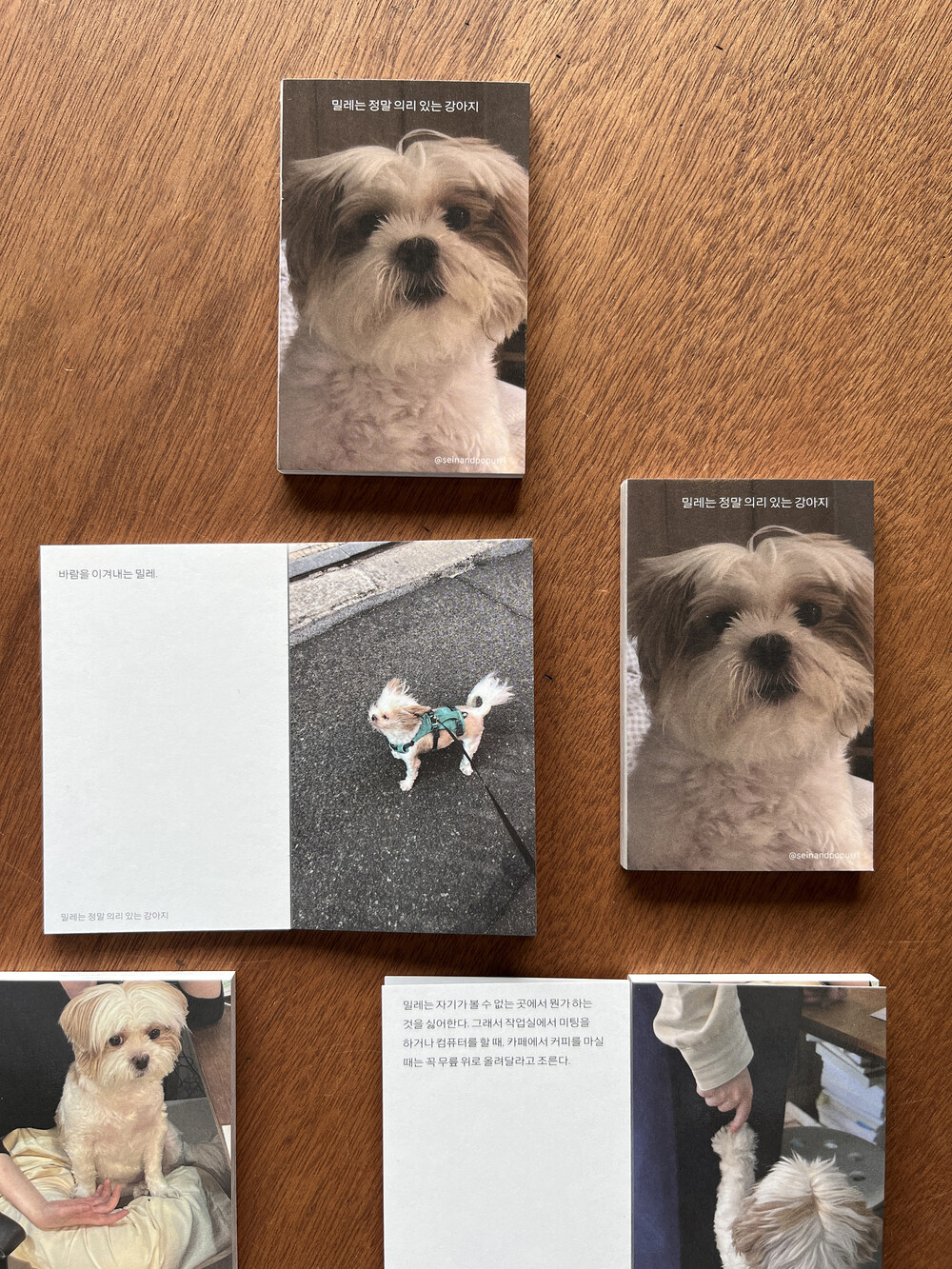 뜯어 쓸 수 있는 미니북 『밀레는 정말 의리 있는 강아지』 겁이 많지만 용맹한 강아지 밀레의 사진 16장을 담았습니다. 뚱한 표정부터 귀여운 표정, 바람을 이겨내는 표정까지 볼수록 정이 가는 밀레의 모습을 보다 보면 책 제목을 자연스럽게 납득하게 됩니다.