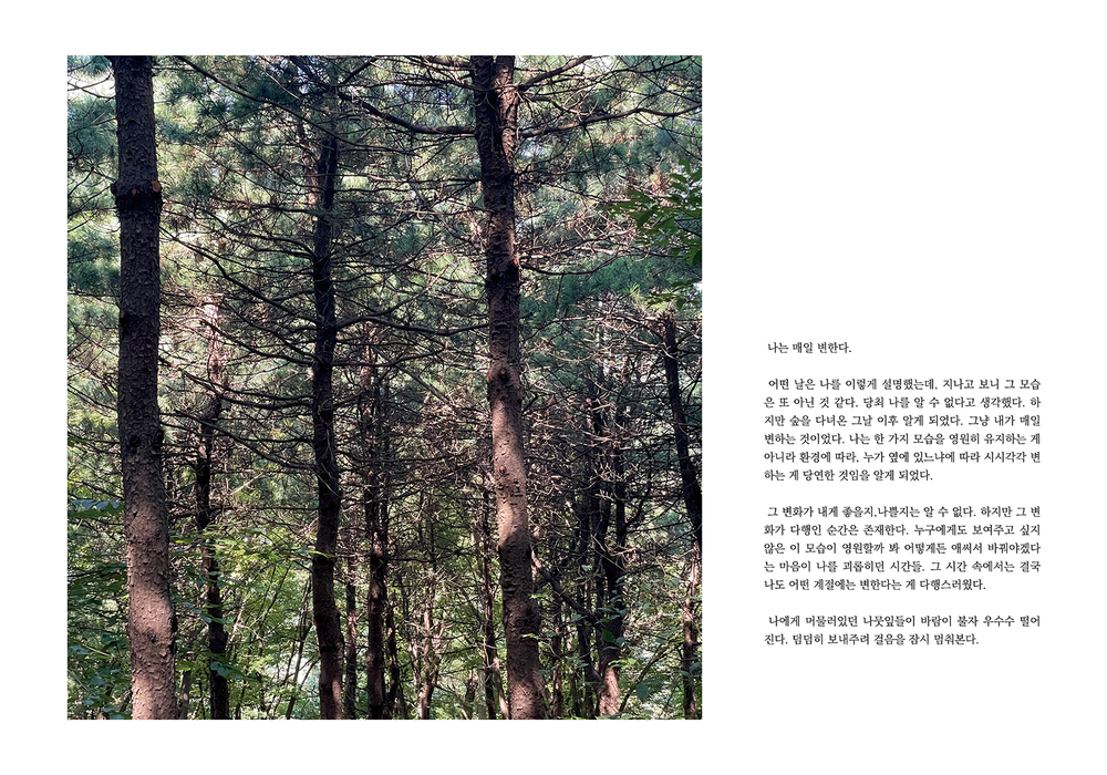 그리고 자신만의 색깔로 생명이 자라나는 모습의 숲은 저의 마음과 닮아 있었습니다.