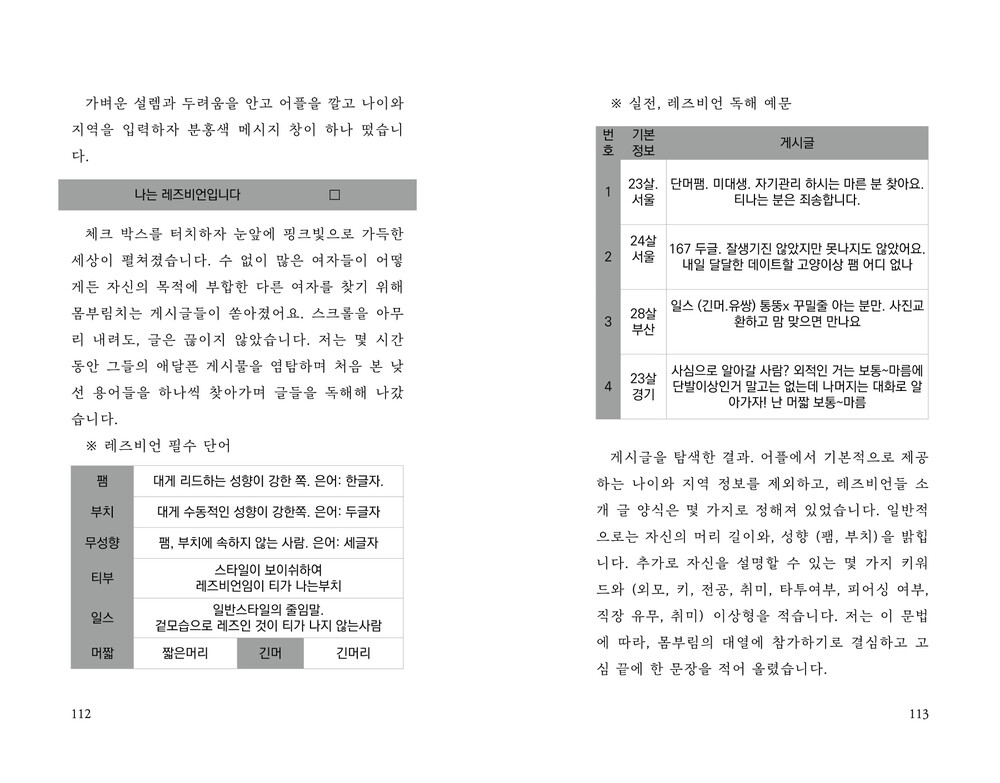 인기가 있을 것이란 오만방자한 자만심은 박살난지 오래였지만, 이미 여성, 정확히는 레즈비언들에게 매료되어버린 저는 ‘여성애’의 세계에서 헤어 나올 수 없었습니다. 때문에 저는, 이전의 허무맹랑한 기대들은 버리고, 새로 태어나기로 결심했습니다. 그들이 나를 알아보기를 기다리는 대신, 내가 먼저 그들 취향에 맞게 바뀌기로 한 것이지요.