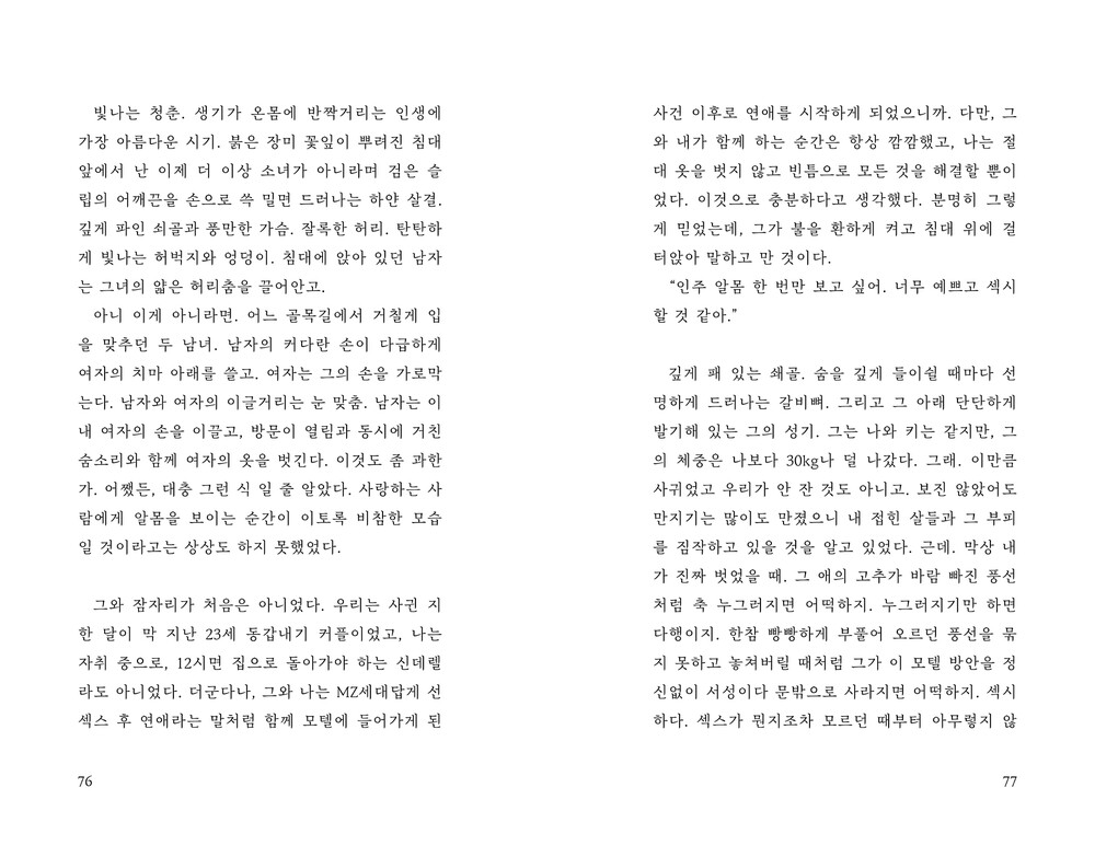 어플을 하고 여자들을 만날수록, 이성애건 동성애건 성애가 존재하는 한 어디든 비슷비슷하다는 것을, 여자들은 나를 알아봐 주지 않을까 하는 기대는 망상에 불과하다는 것을 온몸으로 깨달아갔습니다. 그럼에도 불구하고, 저는 여자들을 만나는 것을 멈추지 못했습니다. 정신을 차려보니 언제인지도 모르게, 여자들의 나직하거나 발랄한 목소리와, 좁은 어깨와, 말랑거리는 살에 흠뻑 빠져버렸기 때문입니다.