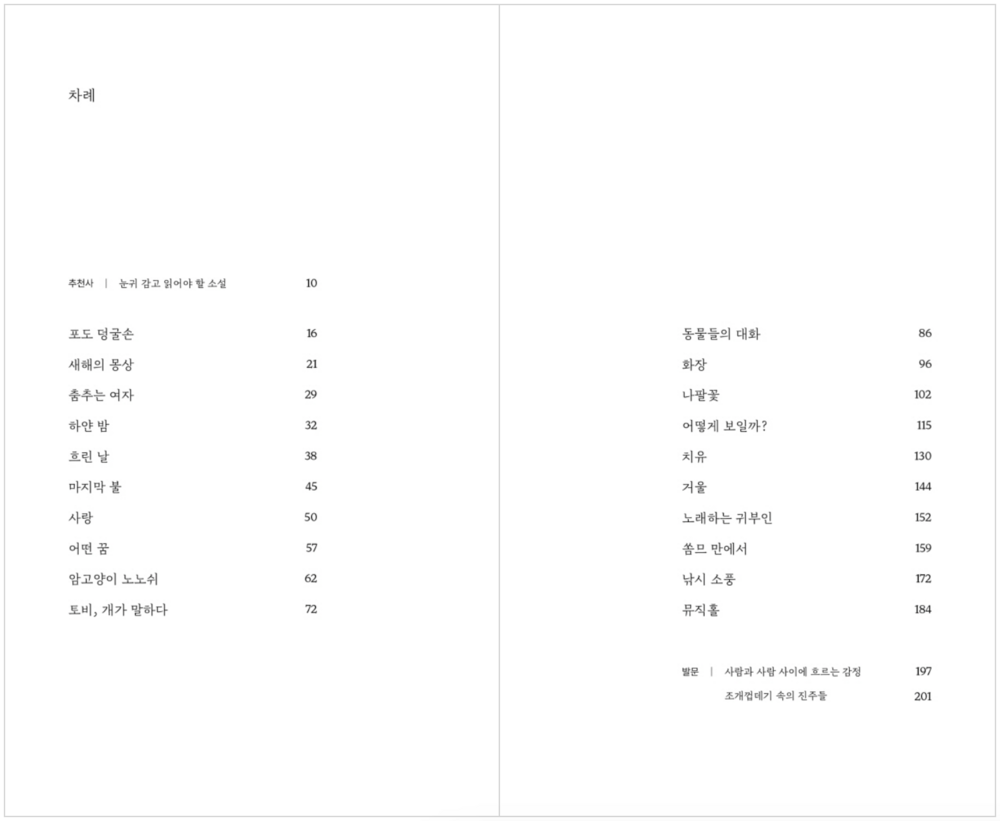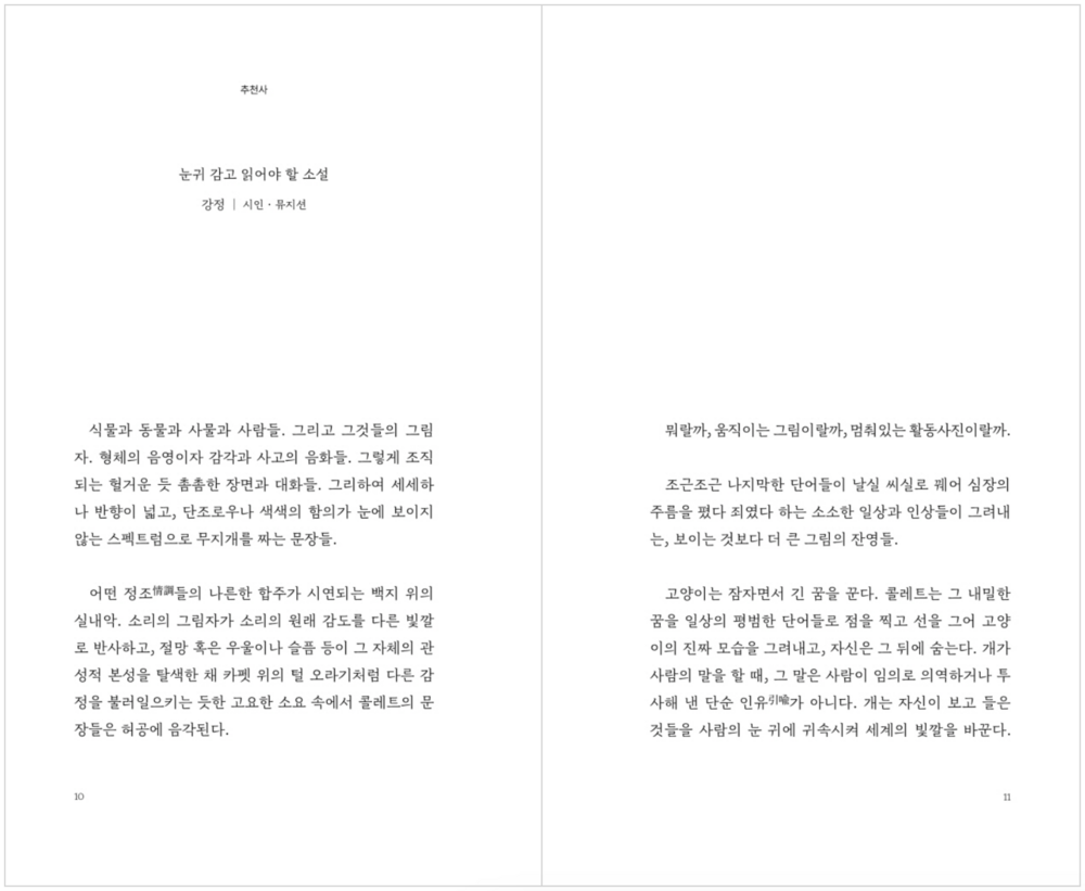 콜레트가 그려내는 것은 풍경 뿐 아니라 심경이기도 해서 등장인물의 속내는 물론이고 사람과 사람 사이에 흐르는 감정이 만져지는 듯합니다. 바닥에 엎드린 강아지와 창밖의 어둠을 응시하는 고양이는 어떤가요. 숨 쉴 때마다 오르내리는 몸의 움직임과 온도 감촉이 손끝을 타고 전해집니다. 나른한 눈빛 너머를 상상하게 합니다. 콜레트의 문장을 따라가다 보면 과즙이 풍성한 포도알을 입에 넣고 터뜨리는 순간처럼 모든 종류의 감각이 생생하게 열리는 경험을 하게 됩니다. 향과 소리와 색과 맛과 촉감 모두를 느껴지게 하는 힘이 있습니다.