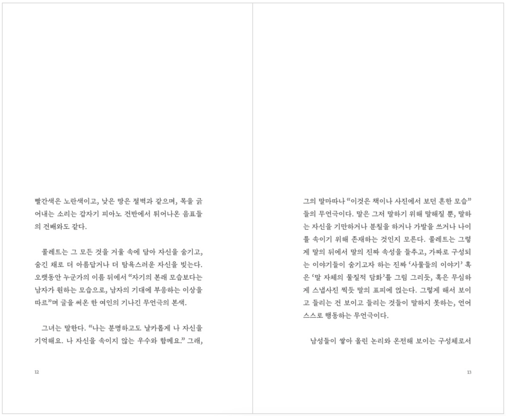 나는 그녀의 펜에서 바람 같은 자유로움, 섬세한 부드러움, 유머러스한 재치, 풍부한 상상력, 엉뚱함이 가득한 호기심, 대상을 대하는 따뜻함 그리고 연약한 듯 보이는 갈대 같은 강함을 발견했다. 고통과 역경에 좌절하지 않고 미래로 나아가는 힘은 그저 강한 것에서만 나오는 것이 아니었다. 비록 고통, 역경, 강함과 같은 것들이 문장 아래에 숨겨져 있더라도. 그래서인지 그녀의 글은 오히려 아름다웠다. 아름답다는 말로는 표현이 부족하기에 아름다움의 의미를 다시 정리하게 만들어 준 이 책으로 많은 분이 콜레트와 사랑에 빠지시길.