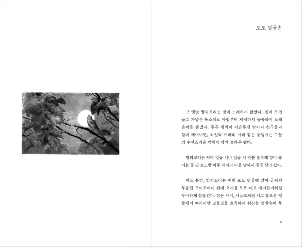 드레스 자락을 물들인 물오른 풀잎을 밟으며 마냥 웃고 떠들었어. 너의 고요한 쾌락은 내 광기를 바라보는 것이었지. 내가 찔레꽃으로 손을 뻗을 때, 너도 알지, 그 탐스러운 들장미 말이야, 내 눈앞에서 너의 손이 가지를 꺾어 발톱 같은 짧고 붉은 가시들을 하나씩 하나씩 떼어내…. 넌 내게 발톱 없는 꽃들을 주었지…. 넌 내게 발톱 없는 꽃들을 주었어…, 내가 가쁜 숨을 돌리고 쉴 수 있게 페르시안 라일락의 영근 수수 그늘로 나를 이끌었지…. 넌 내게 화단의 수레국화를 한 아름 따 주었어, 솜털 같은 꽃술에서 살구 향이 나는 매혹적인 꽃…. 넌 작은 병에 든 커스터드 크림을 주었고 허기진 내 손이 허겁지겁 먹는 모습에 웃음을 터트렸지…. 넌 내게 아주 잘 구워진 황금빛 빵을 주었어, 그리고 내 머리 위에 윙윙거리는 벌을 쫓으려 햇살 아래 너의 창백한 손이 또다시 들려지는 것이 보여…. 구름이 길고 느리게 흘러가는 한낮의 끝에서 내 어깨를 외투로 감쌀 때, 이루 말할 수 없는 기쁨에 취해 소름이 돋았어, 봄날 행복한 짐승들의 천진한 기쁨에 젖어…. 넌 말했지…. “이리 와, 그만 돌아가자”