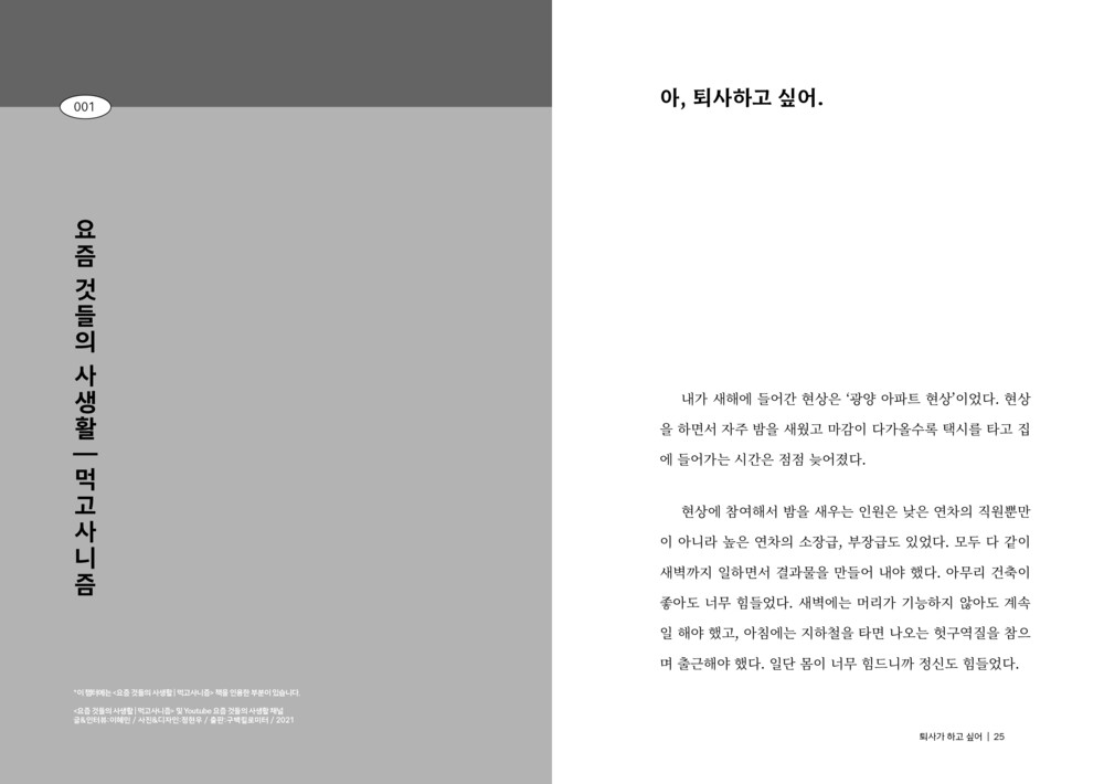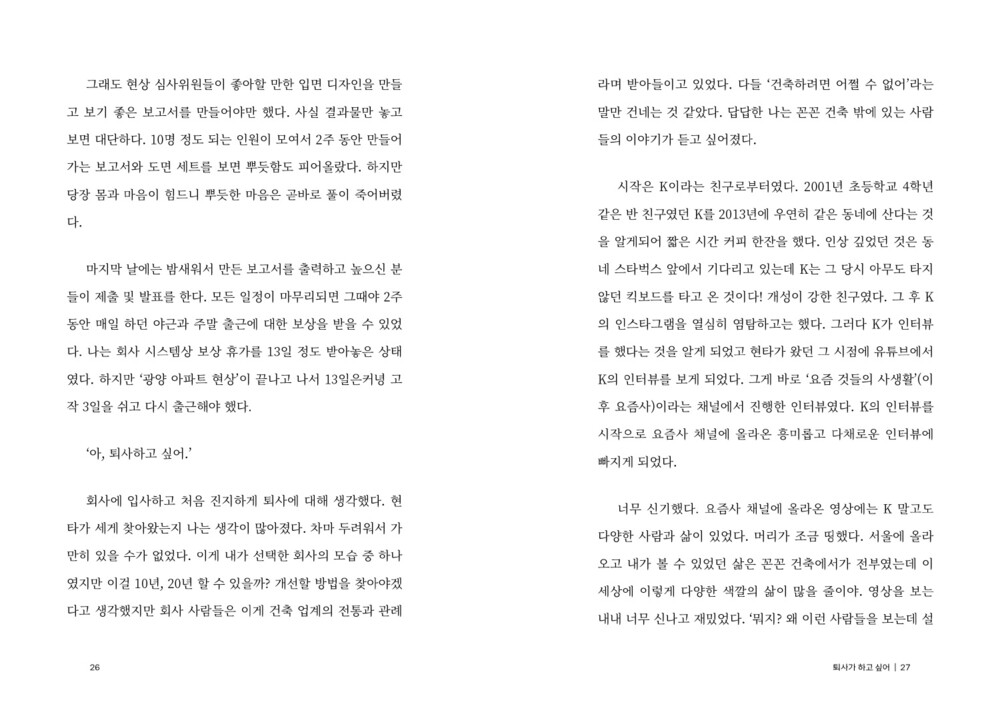 『퇴사 사유서』가 작게나마 누군가에게 고민거리를 던져 주었으면 좋겠습니다. 그리고 퇴사를 고민하시는 분들에게 제 기록이 작은 단서라도 될 수 있다면 더할 나위 없이 기쁠 것 같습니다.