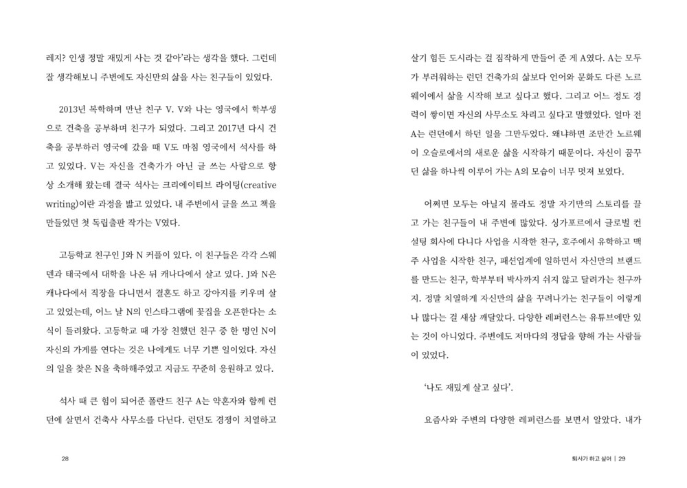 메이저 건축설계 회사에서 재직하던 중에 왔던 ‘현타’를 시작으로 퇴사 고민을 시작했습니다. 고민하면서 시작한 게 바로 ‘점심시간 책 읽기’였습니다. 13권의 책을 읽으면서 내가 좋아하는 것은 무엇인지, 어떤 삶을 살아가고 싶은지, 어떻게 일하고 싶은지, 나에게 중요한 가치는 무엇인지, 업과 회사에 관해 고민하고 삶의 자유와 주체성 그리고 꿈에 관해 고민했습니다. 무엇보다도 한번 하면 돌이킬 수 없는 퇴사가 타당한지 스스로에게 질문했습니다. 그렇게 1년 3개월에 걸친 모든 고민을 『퇴사 사유서』에 담았습니다.