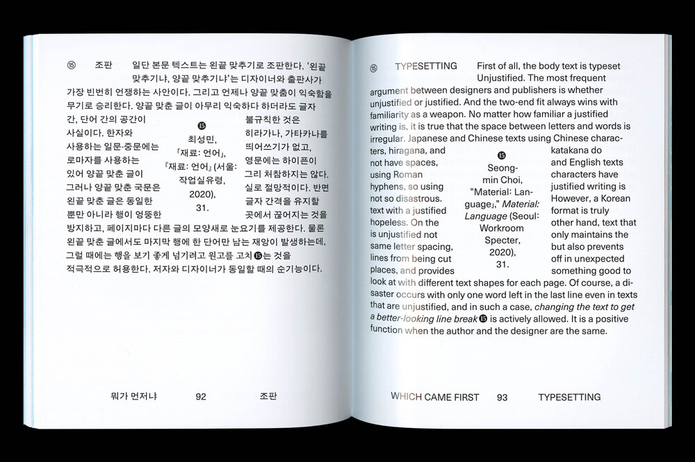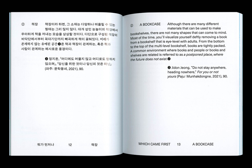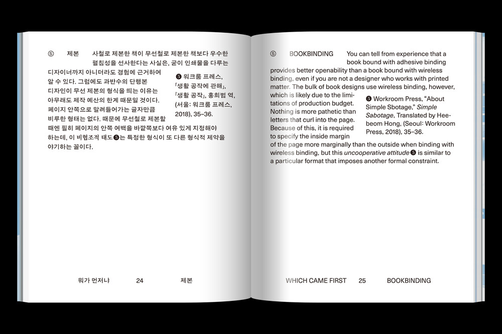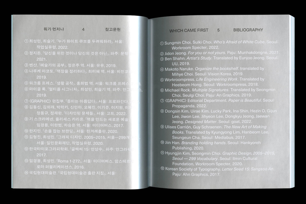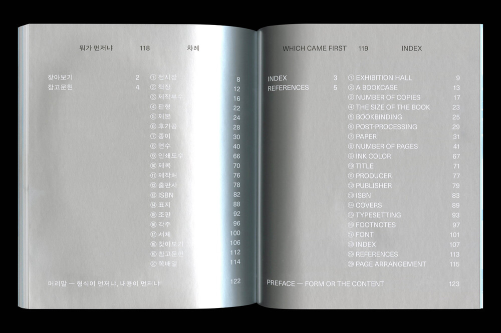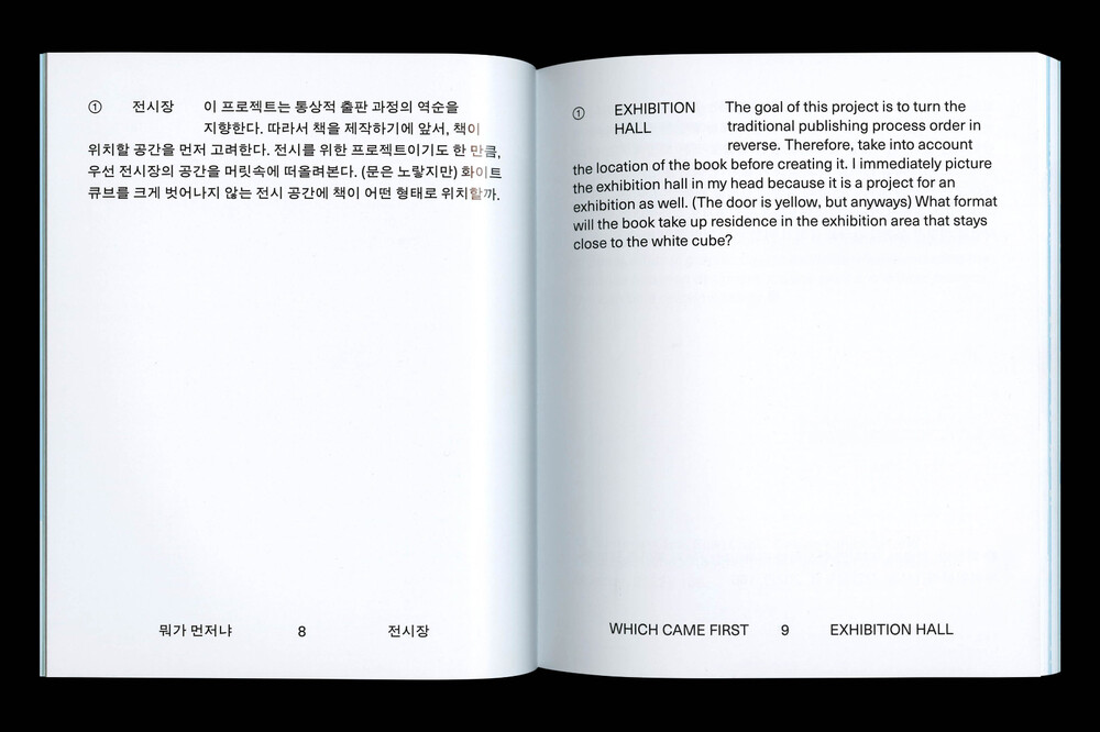 내용은 형식에 앞서 존재하는가? 나아가 형식과 내용에 위계가 존재하는가? 형식과 내용 사이에 선후 혹은 우열은 존재할 수 없다. 형식과 내용은 서로를 존재하게 하는 불가분의 관계이기 때문이다. 선후 혹은 우열에 대한 질문은 ‘닭이 먼저냐, 달걀이 먼저냐?’라고 묻는 것과 같다. 무엇이 먼저이든 형식은 내용을 낳고, 내용은 형식을 낳는다. 『뭐가 먼저냐』는 —책이라는 매체의 제작 과정을 역행하여 구현하는 실험을 통해— 형식과 내용의 관습적 선후 관계를 뒤바꿈으로써, 둘 사이에 먼저와 나중은 물론 우와 열은 결코 존재할 수 없음을 드러낸다.