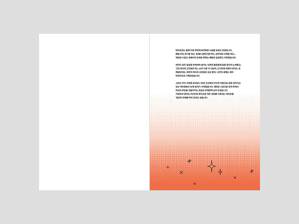 외부의 자극과 감정들은 조금 멀리, 나만의 세계는 점차 안정적으로 구축되었습니다.그리곤 우리 주변을 돌아보니, 일상 곳곳에서 단단한 마음으로 삶을 살아가고 있는 여러분들이 눈에 보이기 시작했습니다.