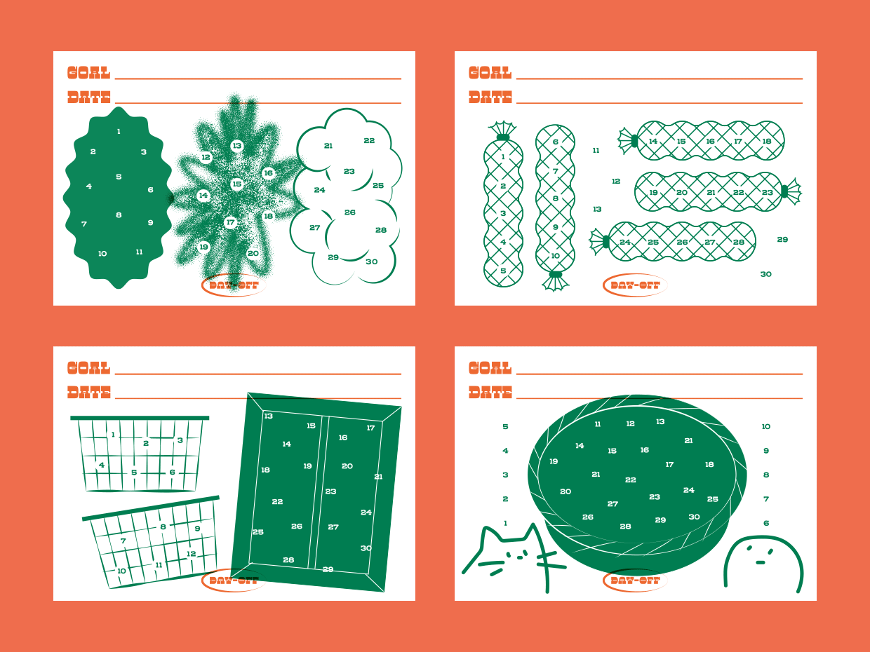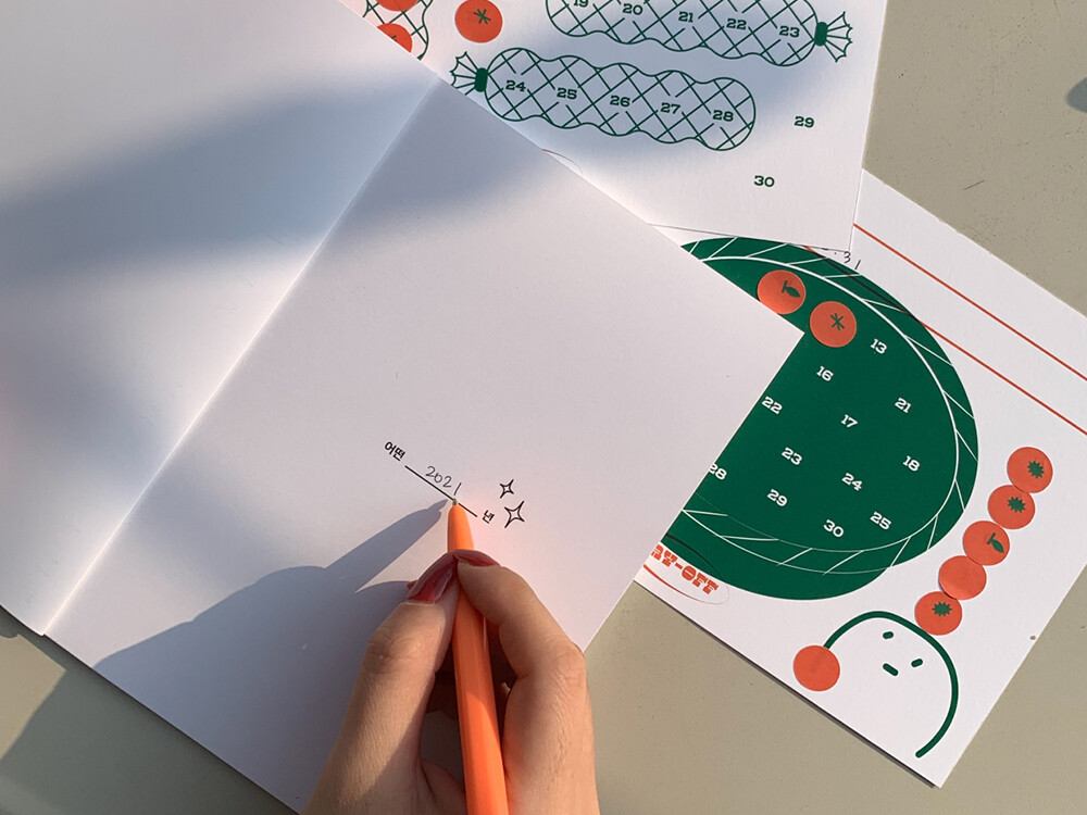 2022년에도, 꾸준히 이어갈 당신의 루틴을 응원하기 위해 준비했습니다. 새로운 마음으로, 조금은 거창하게 목표를 적어 벽에 붙여놔봅시다. 하루하루 목표를 이룬 후 숫자 위에 귤 스티커를 붙여보세요. 그리고 한 달 뒤 귤이 모두 채워진 모습을 상상해 보세요, 얼마나 뿌듯하고 귀여울지!