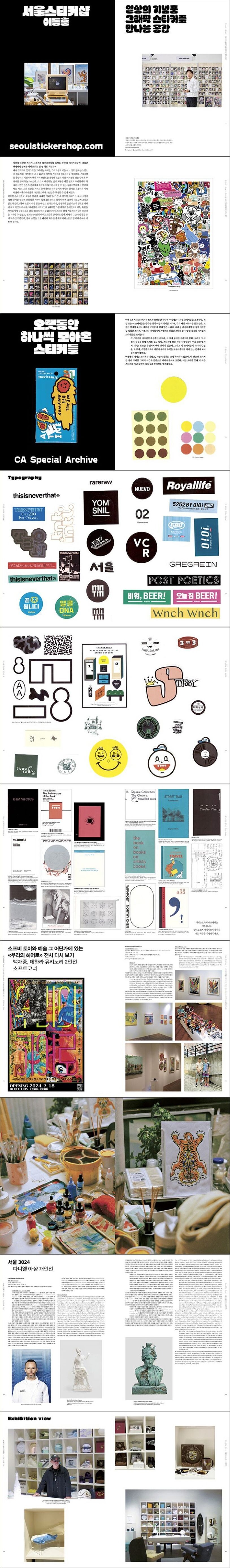 메인 코너에서는 50팀의 로컬 아티스트들이 만든 그래픽 스티커를 만나볼 수 있는 서울스티커샵을 소개한다. 이곳에서는 그래픽 스티커뿐만 아니라 일상의 기념품, 굿즈, 빈티지 제품 등 다양한 프로젝트도 함께 선보인다. CA Archive 섹션에서는 CA가 오랫동안 하나씩 수집해온 디자인 스티커들을 소개한다. 각 스티커의 디자인적 특징뿐만 아니라, 그 뒤에 숨겨진 브랜드와 문화, 그리고 당시의 감성도 함께 느낄 수 있을 것이다.