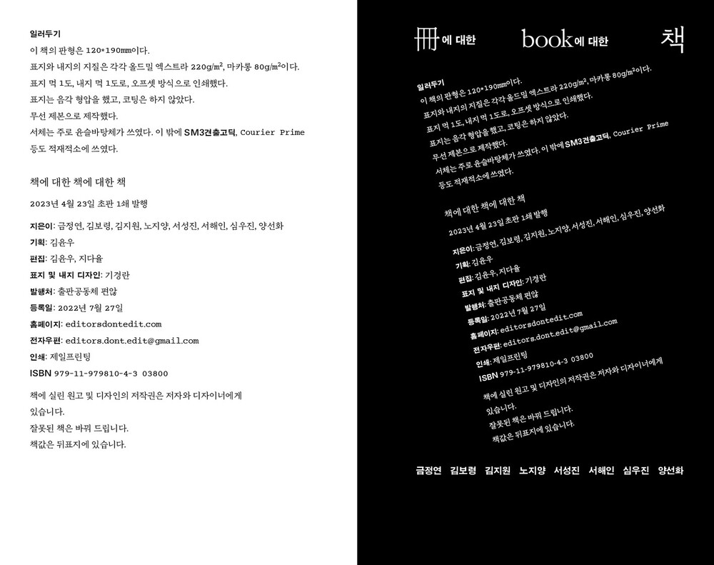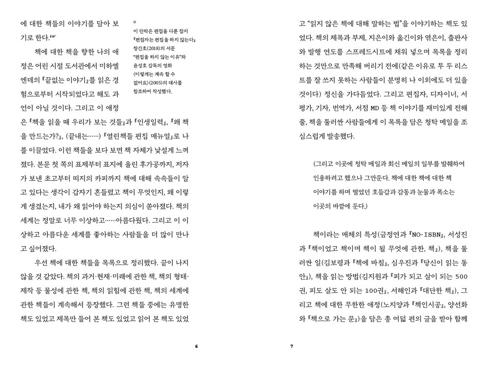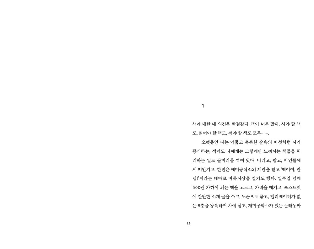 나는 나의 어린 시절과 청소년기를 구성한 종이책의 내용뿐 아니라 표지와 냄새, 그걸 읽던 이불 속의 온도까지 기억하는 사람이기도 하다. 종이책이 지금의 나를 만들었기 때문에, 지금의 나는 종이책을 만든다.