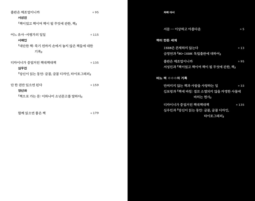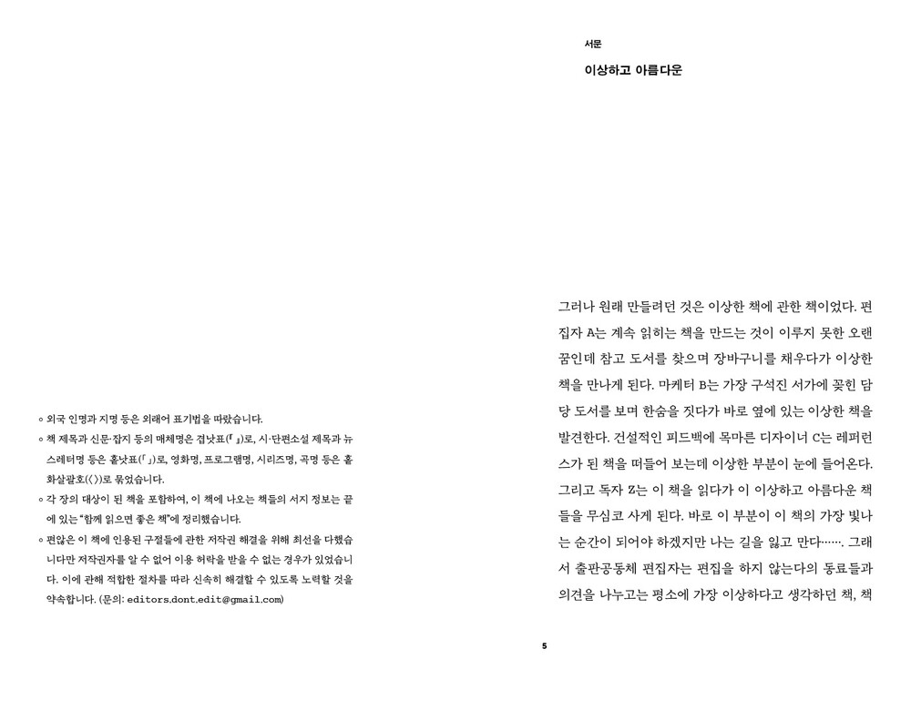 이런 책들을 보다 보면 책 자체가 낯설게 느껴졌다. (……) 책이 무엇인지, 왜 이렇게 생겼는지, 내가 왜 읽어야 하는지 의심이 쏟아졌다. 책의 세계는 정말로 너무 이상하고……아름다웠다. (서문에서)