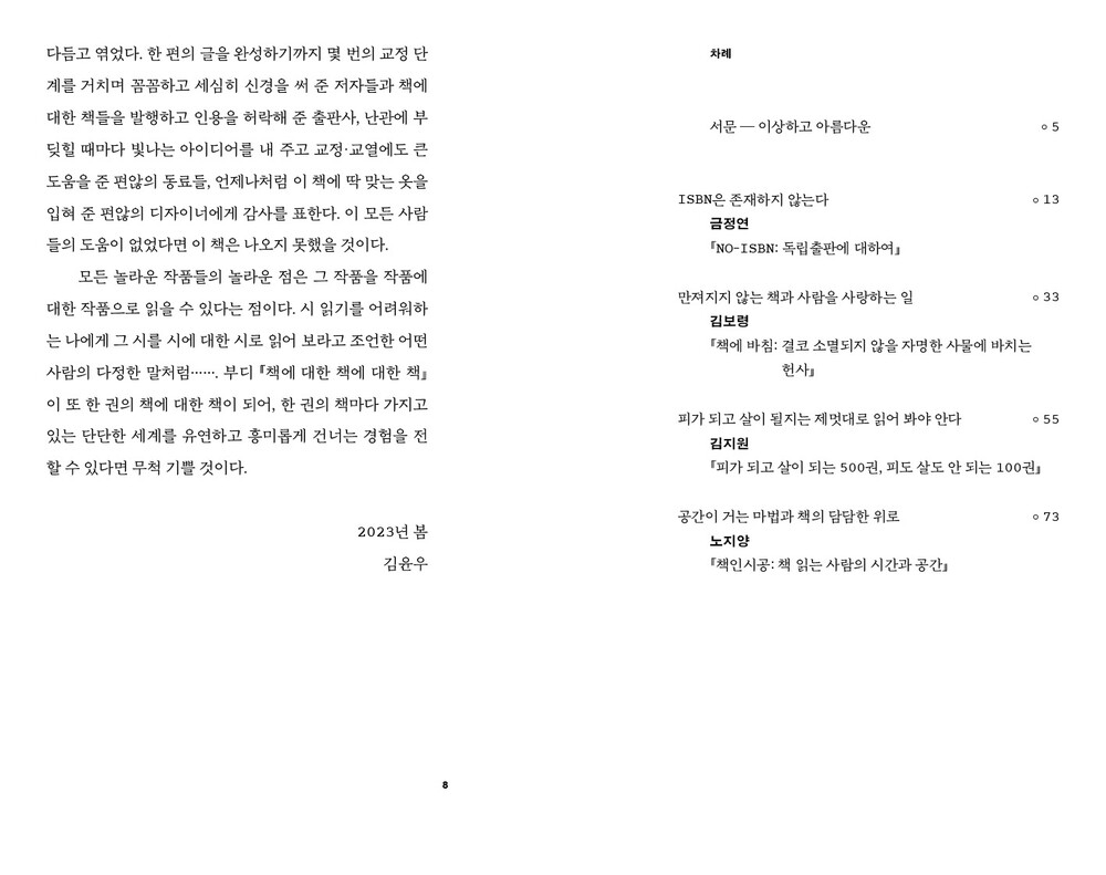 『책으로 가는 문』, 『당신이 읽는 동안』, 『대단한 책』, 『책이었고 책이며 책이 될 무엇에 관한, 책』, 『책인시공』, 『피가 되고 살이 되는 500권, 피도 살도 안 되는 100권』, 『책에 바침』, 『NO-ISBN』. 이 8종의 책들은 저자도, 발행 시기도, 출판사도 모두 다르지만 한 가지 공통점이 있다. 바로 ‘책에 대한 책’이라는 점이다. 이런 책에 대한 책은 필연적으로 이상하고 매력적일 수밖에 없다. 책이라는 매체, 장르, 혹은 범주에 대해서 ‘메타적으로’ 접근하기 때문이다.