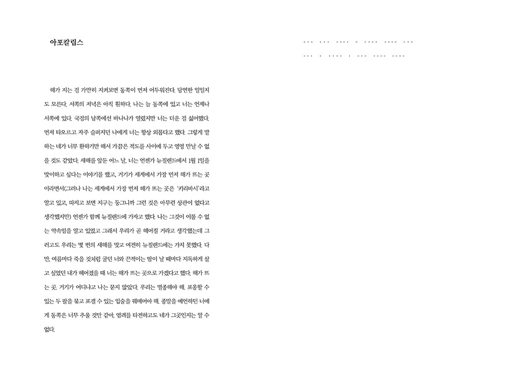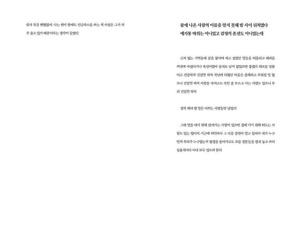아포칼립스 | RE:지구 종말 관련의 건 | 불면의 전말 | 위스키 다이스키 | 각설탕 | 필사必死의 필사筆寫 | 死春期 | 무인도 | 수몰의 형태 | 그의 손가락 끝이 가리키는 것과 그의 손가락 끝 어느 쪽을 | 정전의밤 | 애인들 | 어느 여름 | 술래잡기 | 유월 | [첨부파일] | 우천 시 낙상주의 | 식물성 | The Lovers II(2021) | 미세불운 | 피부와 석회 | 행방불명 | X | 장마철 | 수취인 분명 | 이해할 수 없는 것을 이해하는 법 | july | 염치 불고 | 11월 19일 금요일 저녁 6시 2분 54초의 그림자 내부 구조에 관하여 | 근미래 | 이런 말은 너무 느끼하지만 | 이것은 사랑 이야기가 아닙니다